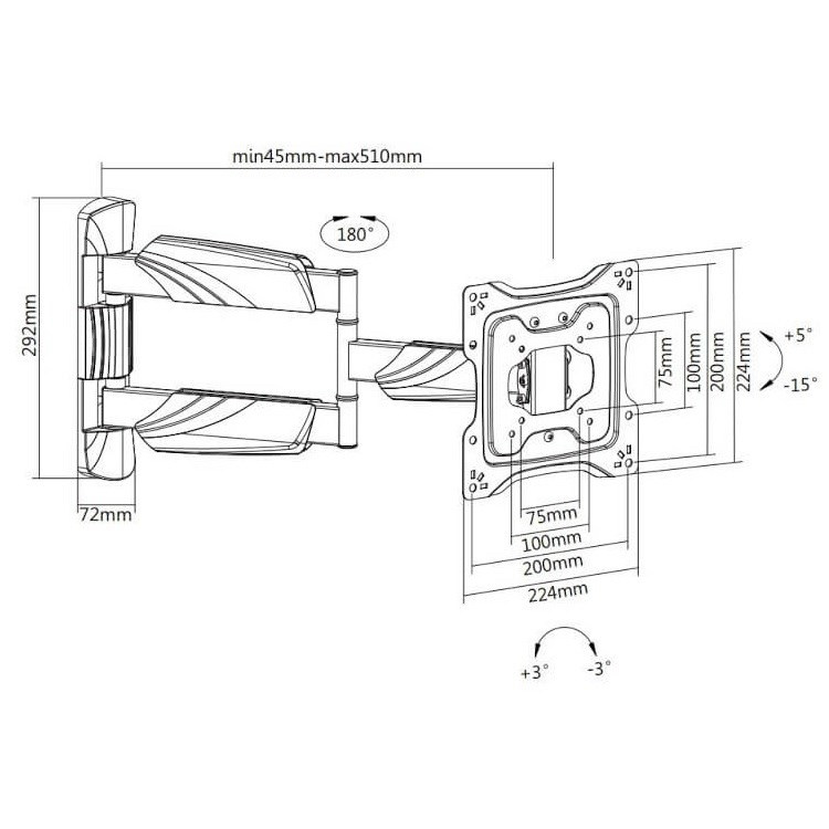 Elegantní plně nastavitelný Tv držák Fiber Mounts DF4Elegantní špičkový držák na Tv 23-55", otáčení do stran +/-90°, naklápění +5°/-15°, vzdálenost od zdi 45-510mm, VESA 75x75 až 200x200, krytky kabeláže, nosnost 35kg.