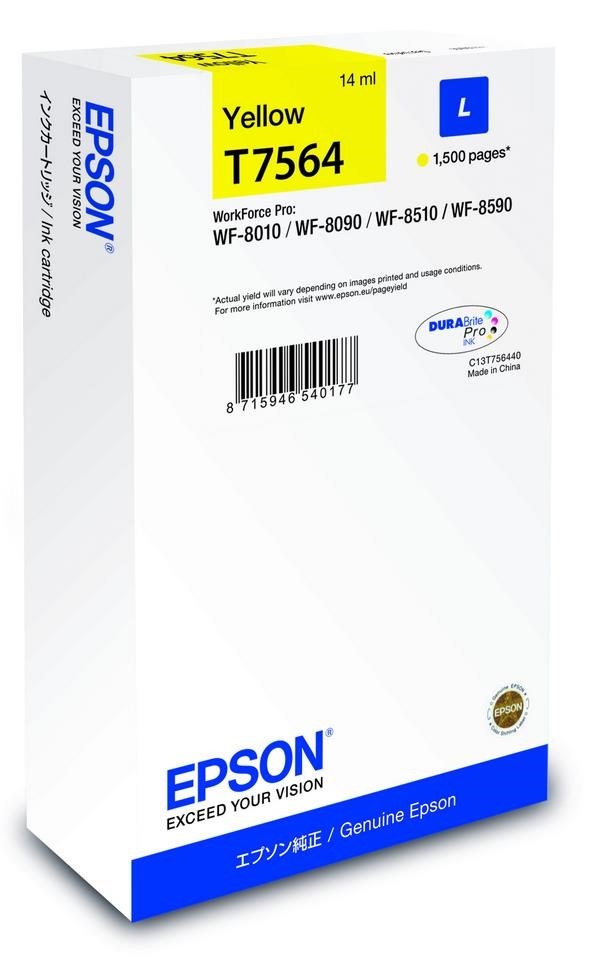 Kód: 1090911Prodejní číslo: C13T756440EPSON Ink bar WF-8xxx Series Ink Cartridge L Yellow - 1500str. (14 ml)