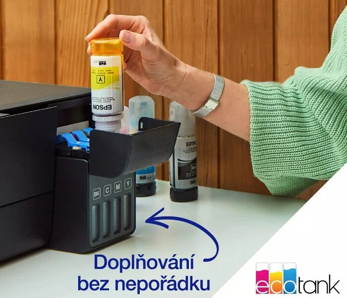 EcoTank poskytuje bezproblémový domácí tisk – inkoustové nádržky s mimořádně vysokou kapacitou umožňují doplňování bez potřísnění a lahvičky s bajonetovým mechanismem jsou navrženy tak, aby bylo možné vložit pouze správnou barvu. Čelní ukazatel hladiny inkoustu vám jasně ukáže, kdy je třeba inkoust doplnit.