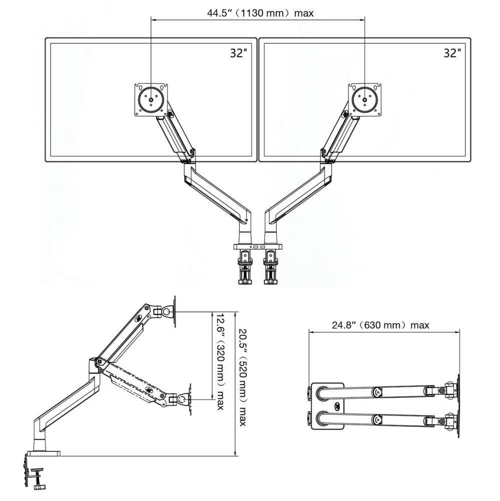 Ergonomický držák 2 monitorů NB G32Profesionální stolní držák na 2 monitory 17-32", nastavitelná výška 200-520mm, otočný +/-360°, náklon +85°/-30°, max. vzdálenost 630mm, PIVOT, USB port, vedení kabeláže, VESA 75x75 a 100x100, nosnost 30kg.