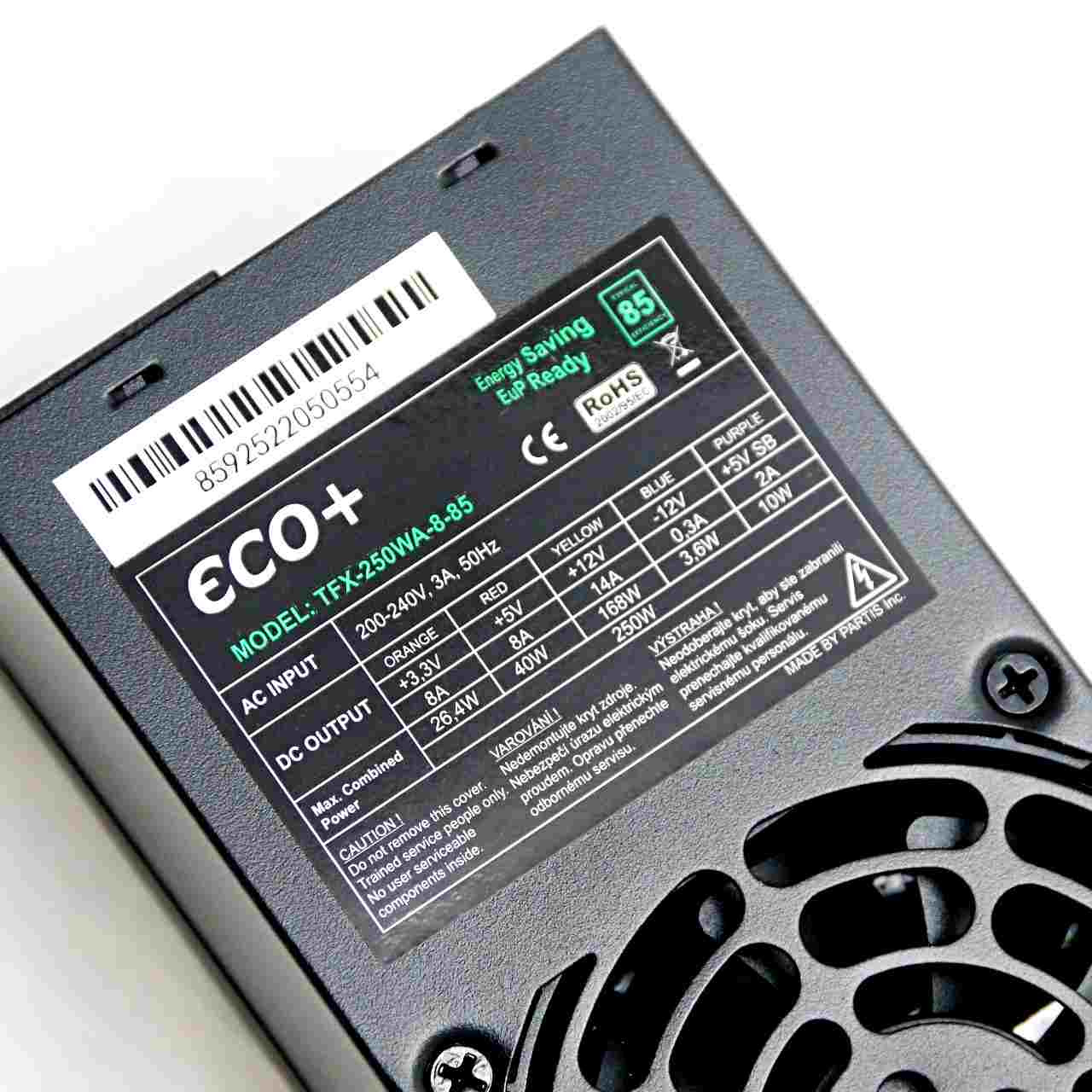 EUROCASE zdroj TFX 250WA-8-85, 250W, ploché kabely, černáVýkon zdroje (W):250; Formát zdroje:TFX; Konektory:8pin CPU 1x, SATA 15-pin, Molex; Konektory pro základní desku:ATX 20-pin, ATX 24-pin, EPS 8-pin; Efektivita zdroje:85+; Podsvícení:Bez podsvícení.
