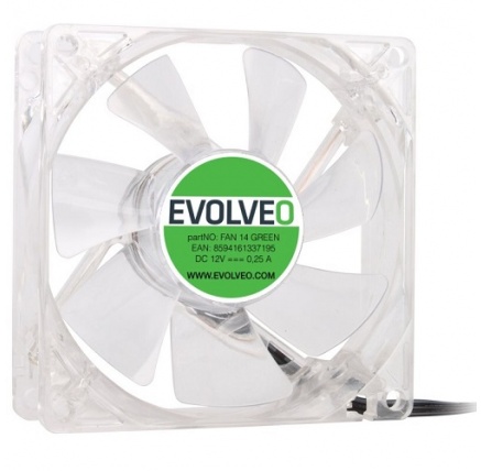 EVOLVEO 14L1GR ventilátor 140mm, 4 LED zelený, 3pinTyp chladiče:Aktivní; Využití chladiče:Do PC skříně; Velikost ventilátoru:140x140; Barva podsvícení:zelená; Napájecí konektor:3pin.