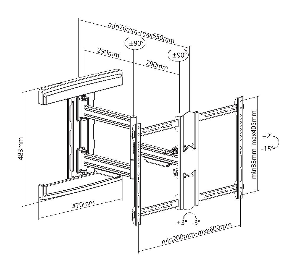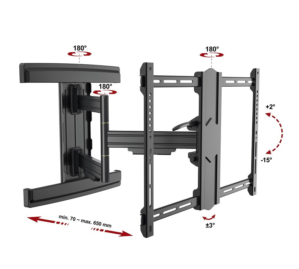 Excelentní držák na televizi Fiber Novelty NortonProfesionální držák na Tv 43-80", nejvyšší kvalita, otočný +/-90°, sklopný +2°/-15°, vzdálenost Tv od zdi 7-65cm, VESA 200x100 až 600x400, nosnost 50kg.