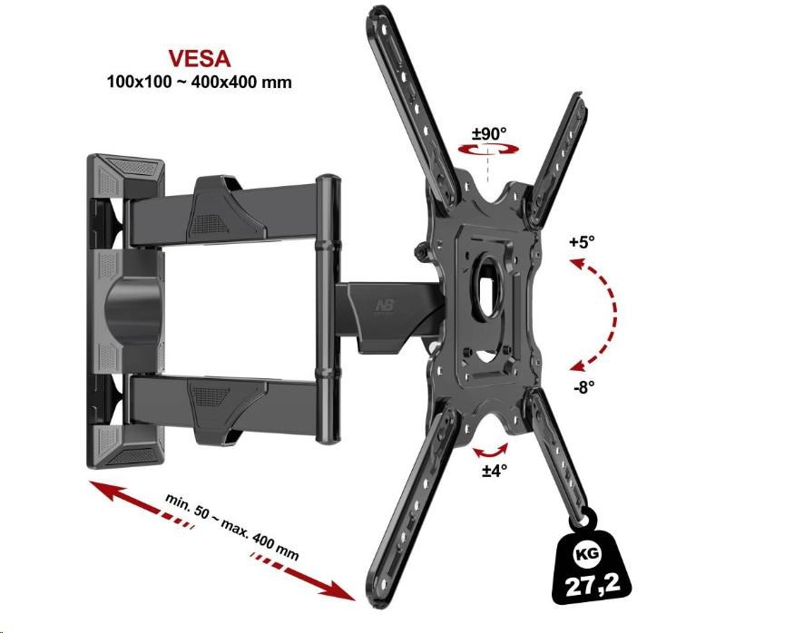 Kompletní specifikace Fiber Mounts DF400 - vynikající kloubový držák na televizory Nástěnný držák na LCD LED QLED plazma Tv 32-55", otočný do stran až +/-90°, naklápění Tv +5°/-8°, korekce roviny +/-4°, vzdálenost Tv od zdi 50-400mm, VESA 100x100 až 400x400, úchytky na kabely, nosnost 27,2kg Kvalitní držák na Tv vynikající konstrukce, který je pevný, stabilní, velmi bezpečný a snadno nastavitelný. Otáčení do stran, náklon dolů i nahoru, změna vzdálenosti od zdi, korekce roviny a montáž jsou u tohoto držáku hračkou, kterou zvládne opravdu každý. A díky velmi výhodné ceně si jej může i každý dovolit. Nyní navíc včetně designových krytek pro skryté vedení kabeláže. Balení obsahuje instalační materiál - hmoždinky, vruty, šrouby a distanční kroužky. Levný televizní držák ve špičkové kvalitě - ručíme za vaši spokojenost - Fiber Mounts DF400 Technické údaje: nosnost 27,2kg doporučujeme na TV 32" až 55" podporuje VESA standard 100x100 až 400x400 (nepodporuje VESA 400x300) otáčení do stran +90° až -90° náklon +5° až -8° odsazení od zdi 50mm až 400mm korekce roviny obrazovky +4° až -4° krytky na kabeláž instalační materiál součástí balení vynikající kvalita materiál ocel barevné provedení černé záruka 5 let.