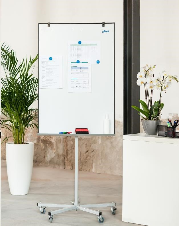 Flipchart AVELI MOBIL 5 představuje jednoduchou prezentační pomůcku pro firemní porady a školení. Je to nepostradatelní a efektivní pomocník ve světě vizuální komunikace. Povrch flipchartu AVELI je vhodný pro všechny za sucha stíratelné popisovače. Bez papíru flipchart funguje jako bílá popisovatelná tabule.