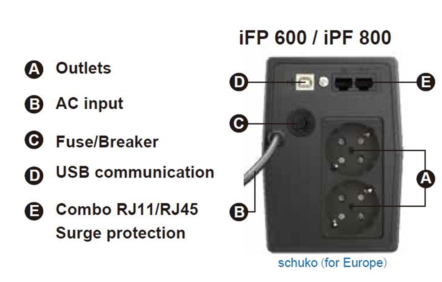 Fortron UPS FSP iFP 600, 600 VA / 360W, LCD, line interactivePočet výstupních zásuvek:2; Použití:Desktop; Provedení:Tower; Zdánlivý výkon VA:600; Topologie:Line-Interactive; Fáze (Vstup/Výstup):1:1; Komunikace:USB; Možnosti:Výstupní zásuvky SHUKO GR (vidlice); Typ výstupu:SCHUKO; Ochrana telefonní sítě; Ochrana datové sítě.