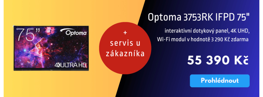 Optoma 3753RK IFPD 75"LED 75" 4K UHD displej (3840×2160) s poměrem 16:9 a jasem 450 nit nabízí ostrý obraz, živé barvy a široké možnosti připojení: LAN, HDMI, VGA, USB, 3.5mm Jack, DisplayPort i USB-C. Podporuje uchycení VESA 800×400.