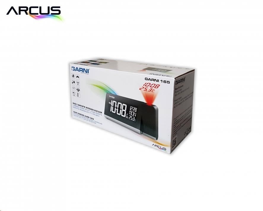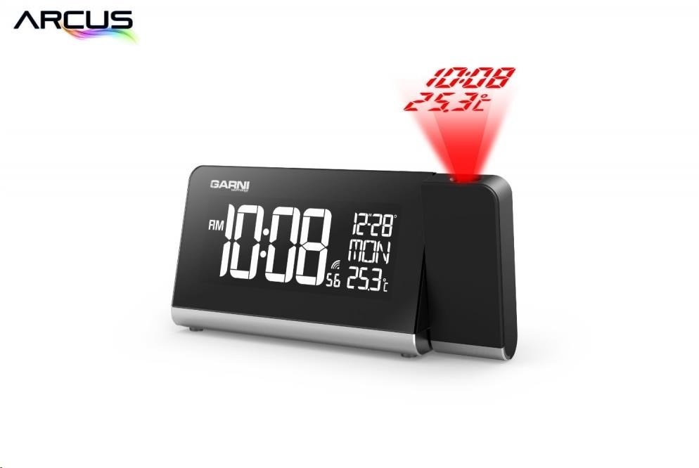 GARNI 165 Arcus - digitální budík s projekcí času a vnitřní teplotyZobrazení času:Digitální; Provedení:Stolní; Vlastnosti:Měření teploty, Promítání času, Datum.