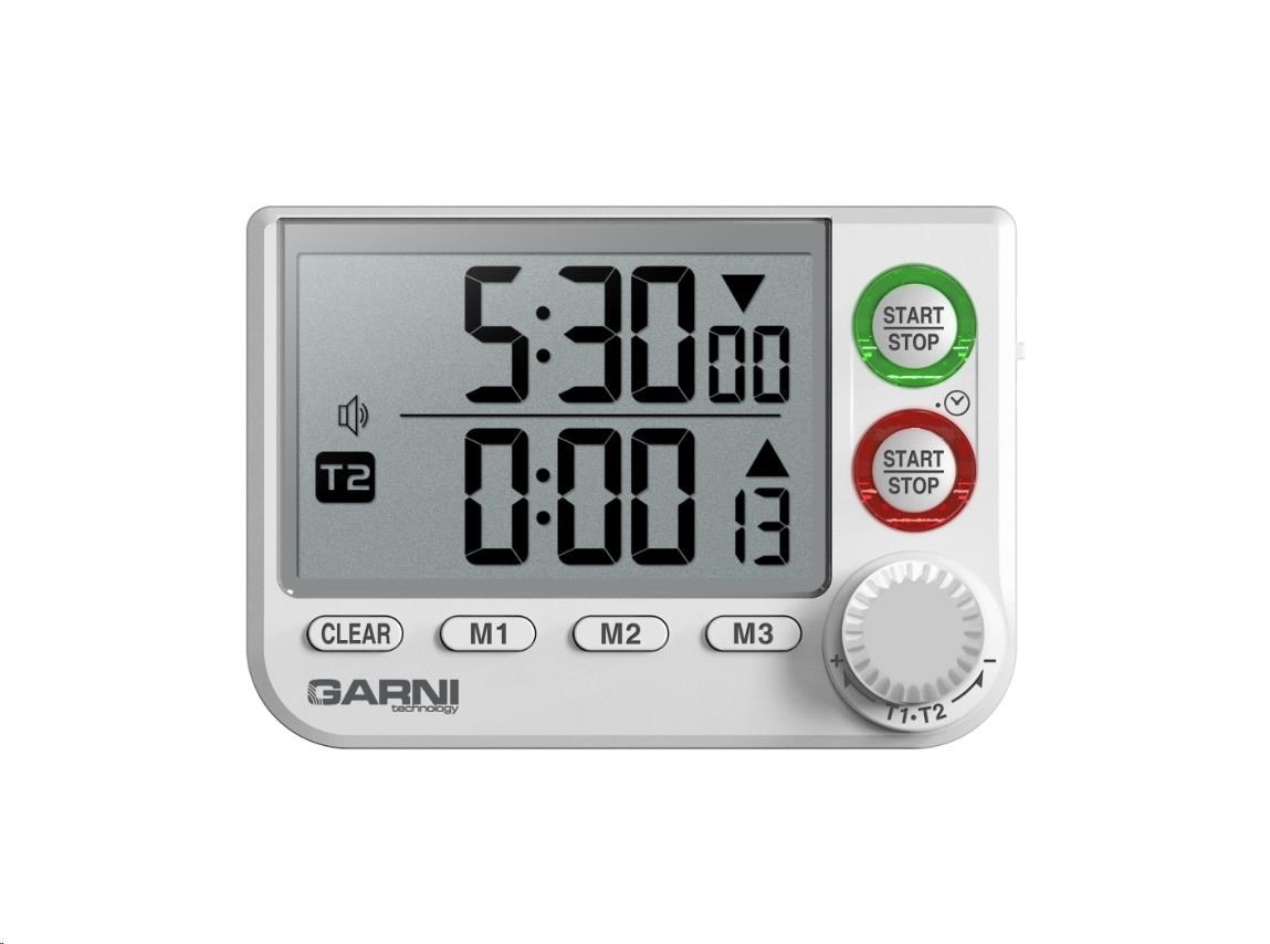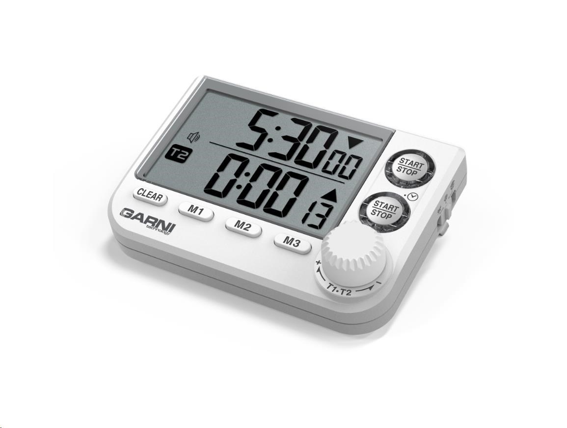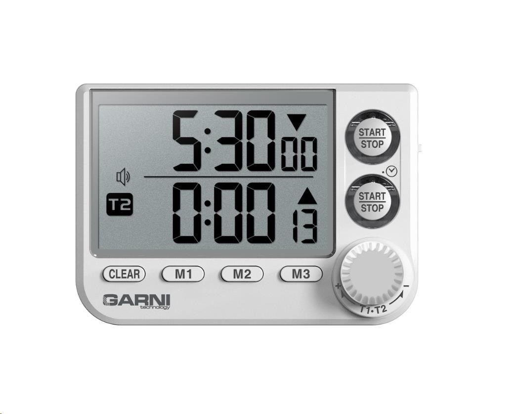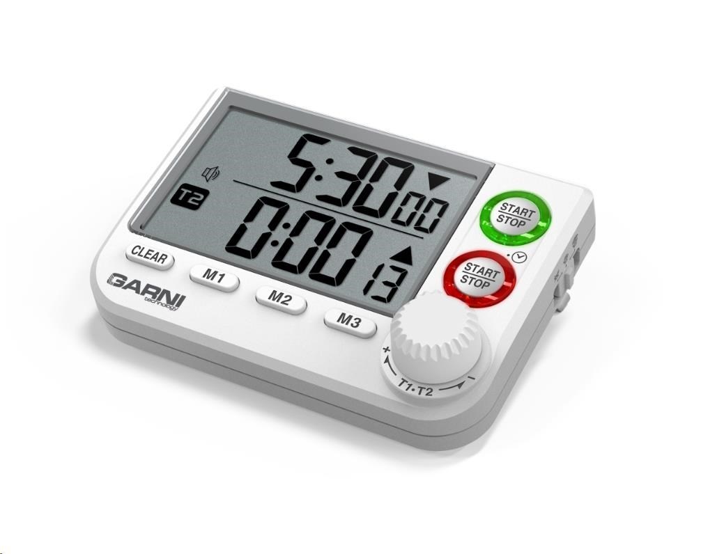 GARNI KT2 - časovač (minutka)Časovač (minutka) se stopkami a hodinami s inteligentním otočným knoflíkem pro snadné a rychlé nastavení. Dvouřádkový displej o rozměrech 60 x 38 mm. Signalizace zelenou a červenou LED diodou. Dva režimy pro výběr časovače (hodiny-minuty, minuty-sekundy).