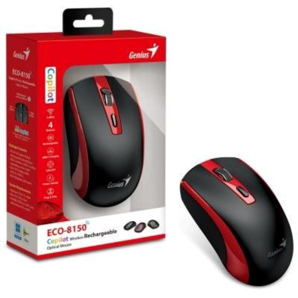 GENIUS myš ECO-8150/ 1200 dpi/ bezdrátová/ dobíjecí/ Copilot/ černo-červenáRozhraní myši:Bezdrátová s USB dongle; Druh myši:Optická; Specifikace myši:4 a více tlačítek, S kolečkem.
