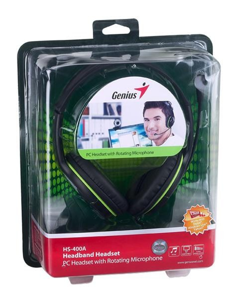 GENIUS sluchátka s mikrofonem HS-400A, černozelená, + redukce na Single JackTyp sluchátek:Plná, Okolo uší; Konstrukce:Uzavřené; Využití:Poslech hudby; Konektivita:Jack 3,5 mm; Mikrofon; Konstrukce mikrofonu:Sklápěcí; Délka kabelu (m):2; Vedení kabelu:Jednostranné; Platforma:PC / mobil; Hmotnost (g):160; Rozhraní sluchátek:3.5 jack; Vlastnosti sluchátek:S mikrofonem, Ovládání hlasitosti.