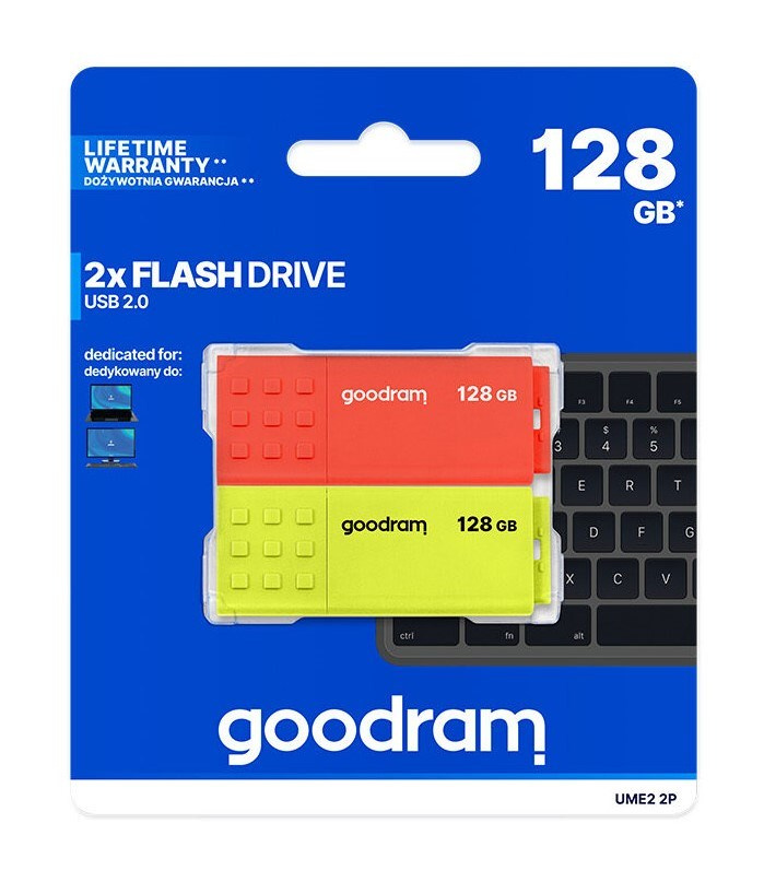 GOODRAM Flash Disk 2x128GB UME2, USB 2.0, červená, žlutáKapacita uložiště:128 GB; Verze USB:2.0.