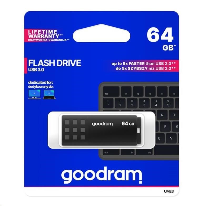 GOODRAM Flash Disk 64GB UME3, USB 3.0, černáFlash disk, Barva Černá, Kapacita 64 GB, Rychlost čtení 60 MB/s, Rychlost zápisu 20 MB/s, Typ USB USB 3.0