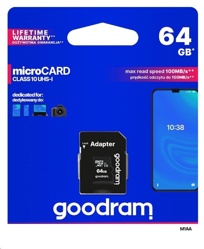 GOODRAM MicroSDXC karta 64GB M1AA, UHS-I Class 10, U1 + adaptérTyp karty:Micro SDXC; Kapacita uložiště:64 GB.