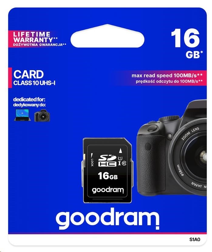 Kód: 490116Prodejní číslo: S1A0-0160R12GOODRAM SDHC karta 16GB (R:100/W:10 MB/s) UHS-I Class 10
