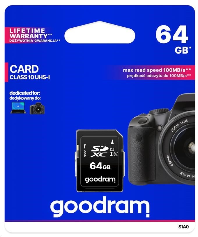 Kód: 490118Prodejní číslo: S1A0-0640R12GOODRAM SDXC karta 64GB (R:100/W:10 MB/s) UHS-I Class 10