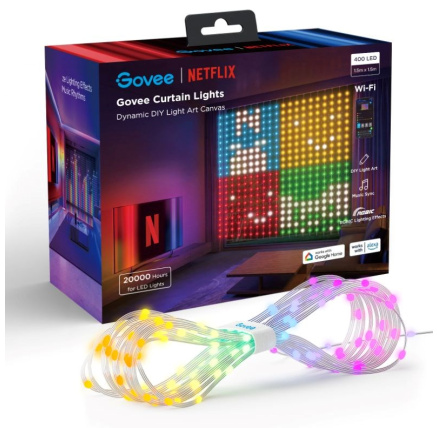 Světelná opona Govee Netflix Curtain Light předvedou dokonalou světelnou show. Díky technologii RGBIC dokáže opona složit obraz z 400 nezávisle fungujících diod na ploše 1,5 x 1,5 metrů. Popusťte uzdu své fantazii a realizujte své nápady na LED plátně v 16 milionech barev. S oponou Govee budete dokonale připraveni pro každou příležitost, roční období nebo svátek. Přes 80+ přednastavených scén, 3 možnosti instalace a několik automatických i manuálních režimů dodá vašemu prostoru unikátní vzhled. Příkazy můžete zadat také hlasem přes Siri, Amazon Alexa nebo Google Assistant, přes aplikaci Govee Home na chytrém telefonu nebo tabletu. Díky podpoře protokolu Matter můžete oponu začlenit téměř do všech Smart Home systémů včetně HomeKit a Samsung Smart Things. Aby to nebylo málo, můžete propojit až tři opony a vytvořit tak plochu 4,5 x 1,5 metrů. To už je slušná plocha pro světelné graffiti. Govee s Netflix pravidelně spolupracuje, a i nyní si můžete v aplikaci navolit speciální Netflix scény