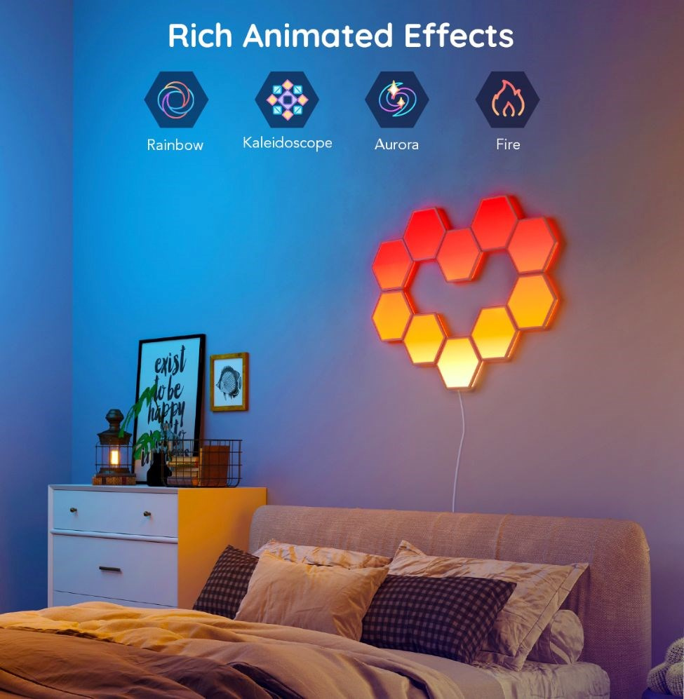 Govee Hexa nabízí 38 různých režimů pro dokonalé naladění světelné atmosféry. Govee technologie RGBIC umí zobrazit až 57 barev najednou z celkové škály 16 milionů barev při intenzitě 1-100%. Může se také pochlubit životností až 50.000 hodin.