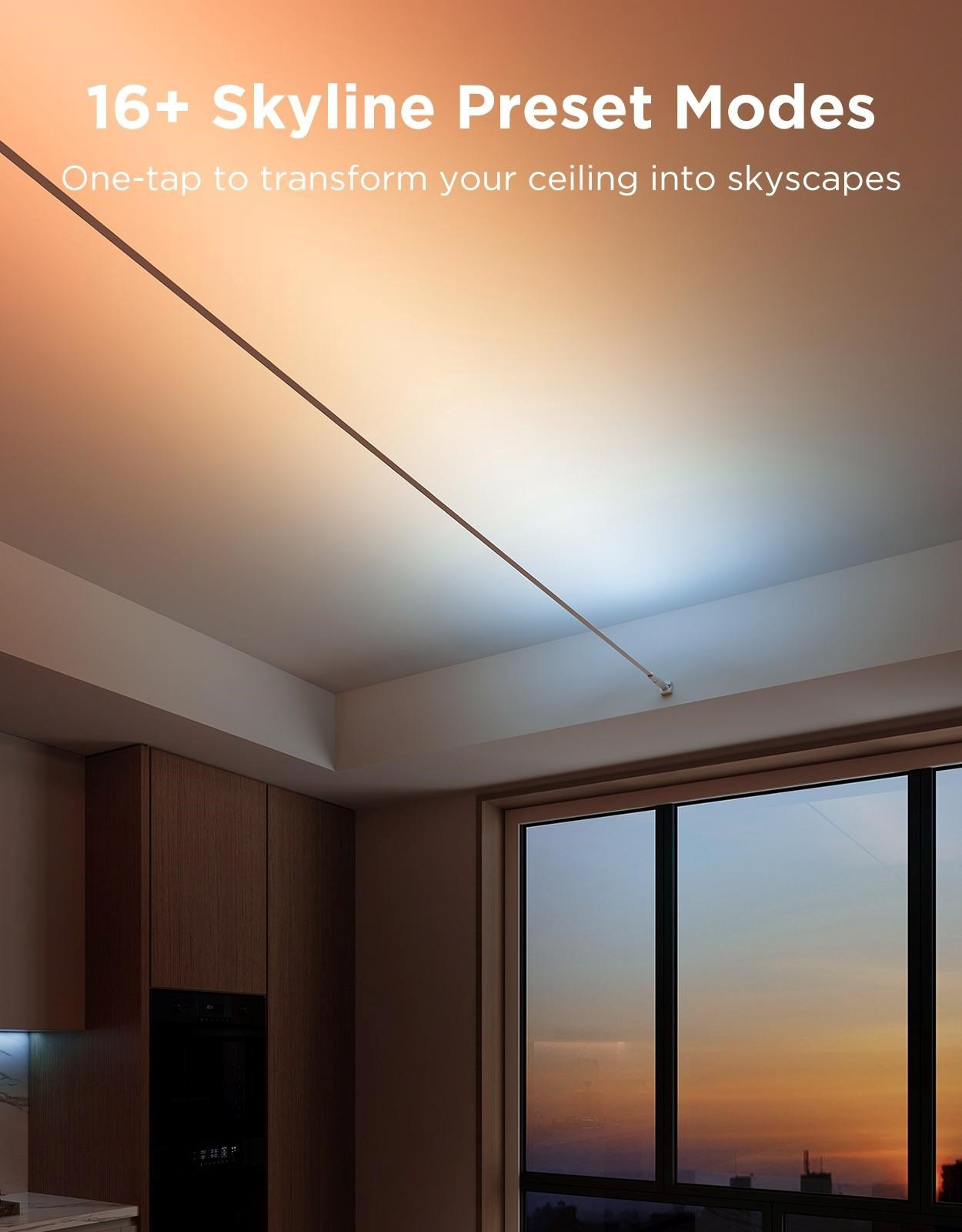 Součástí Govee Strip Light je 16 speciálních Skyline presetů, které byly navrženy přímo pro zavěšenou instalaci s „wall-washing“ efektem. Každý z nich vytváří jedinečné barevné přechody a světelné hry, jež působivě podtrhnou prostor. Díky těmto efektům dosáhnete profesionálního nasvícení bez složitého nastavování.