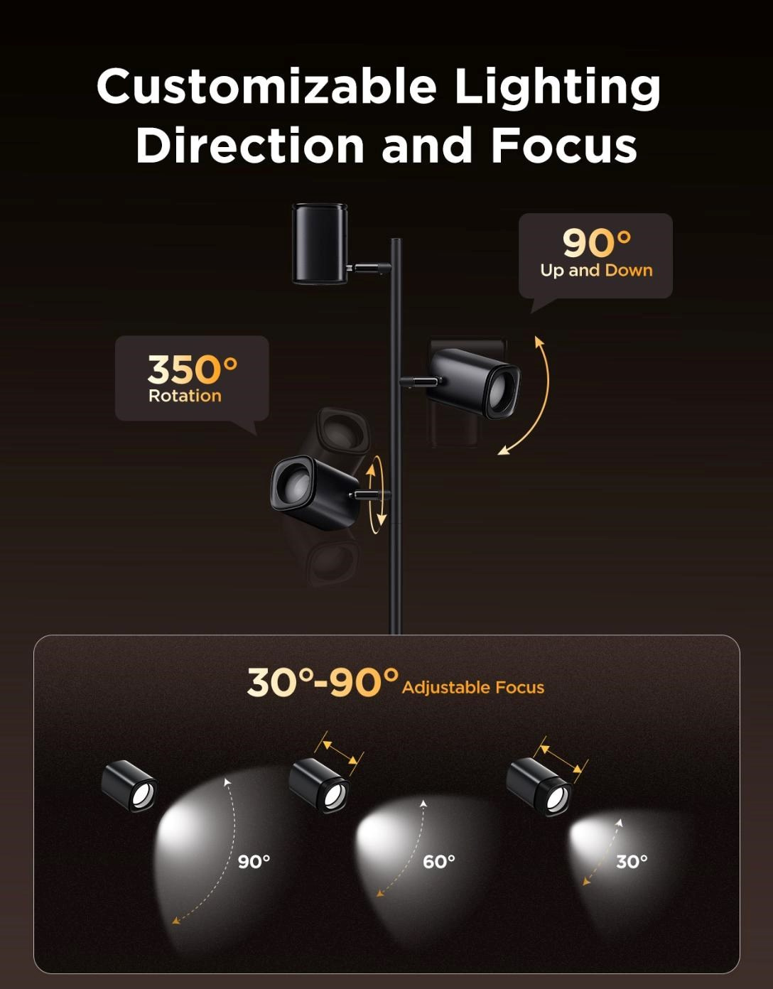 Každé rameno lampy je plně nastavitelné, což vám umožní najít dokonalý úhel a směr světla. Ramena se otáčejí o 350° horizontálně a 90° vertikálně, zatímco hlavice nabízí jemnou rotaci 30°–90°. Tím dosáhnete přesného nasvícení prostoru podle vašich potřeb. Flexibilní ovládání každého zdroje samostatně vám dává kontrolu nad jasem, barvou i zapnutím. Díky této variabilitě je lampa skvělá jak pro čtení, tak pro zvýraznění designových prvků v interiéru.