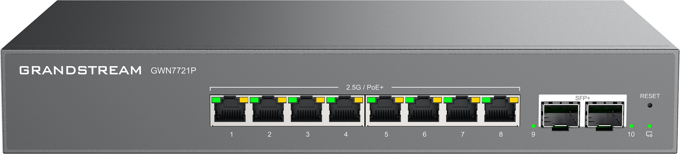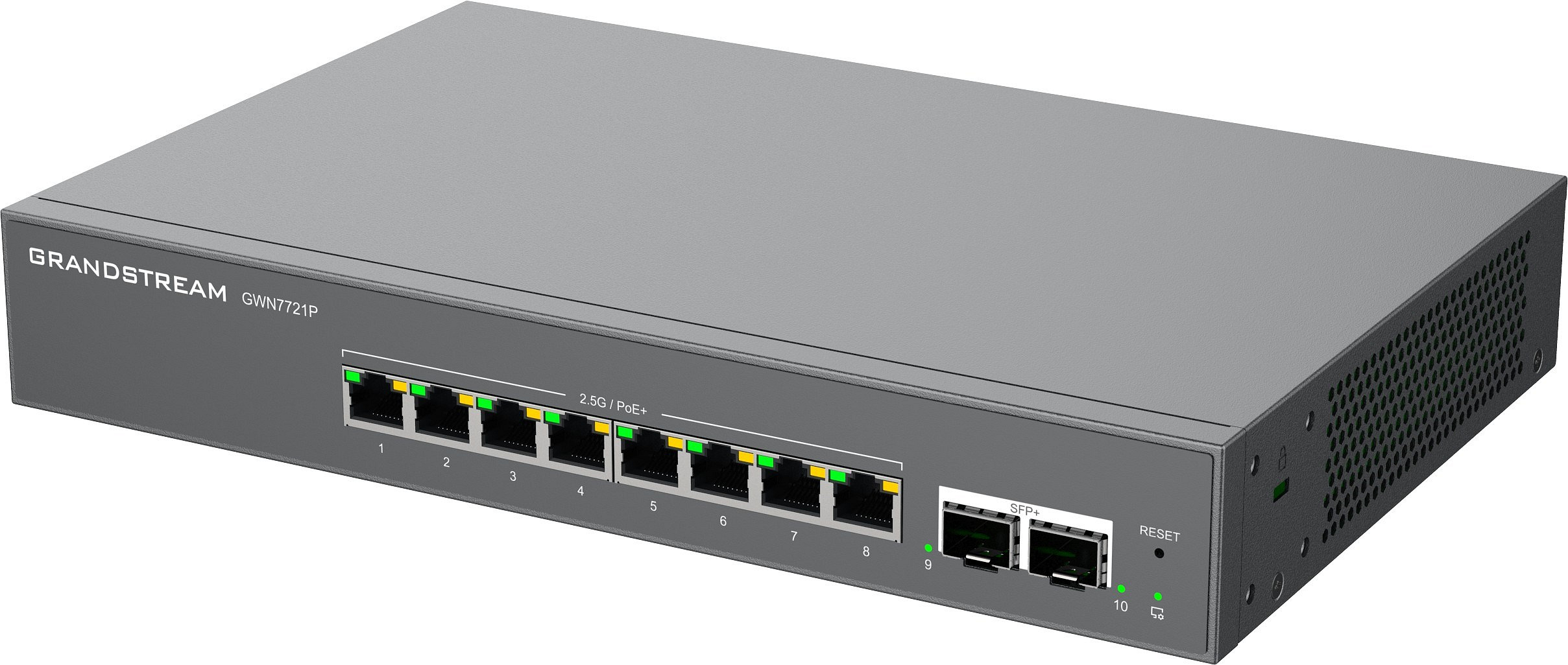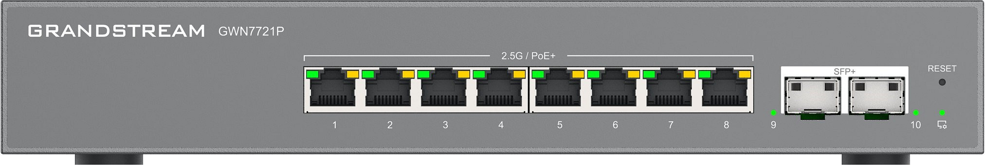 Modely GWN7721 a GWN7721P jsou 10portové spravované přepínače Layer 2 Lite vybavené 8 porty 2,5 Gigabit Ethernet a 2 porty 10 Gigabit SFP+, které umožňují malým a středním podnikům budovat škálovatelné a bezpečné vysokorychlostní sítě.