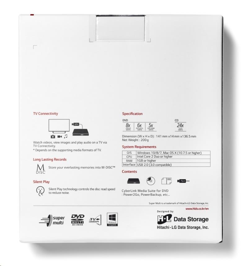 Jedná se o tenkou externí DVD vypalovací mechaniku. Je schopna vypalovat na DVD±R(DL)/RW/RAM, CD-R/RW a dokonce i odolné M-Disky. Poskytuje rychlost zápisu max. 5/6/8/24x a čtení max. 4/5/6/8/24x, dle typu média. K připojení k zařízením využívá rozhraní USB 2.0. Její rozměry činí 144 x 14 x 137,5 mm.