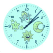 • analogové nástěnné hodiny • čas řízený krystalem • tichý chod • materiál lepenka • průměr ciferníku 300 mm • napájení 1 ks baterie typ AA 1,5 V (tužková, není součástí balení) • zeleně fosforeskující ciferník s obrázky, číslice černé.