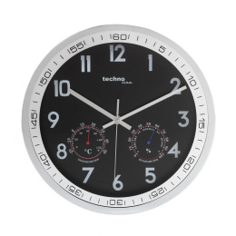 • analogové nástěnné hodiny • čas řízený krystalem • materiál kov a plast • průměr ciferníku 277 mm • dva ciferníky pro zobrazení teploty a relativní vlhkosti • napájení na 1 ks baterie typ AA 1,5 V (tužková, není součástí balení) • chrom, ciferník černý, číslice bílé.