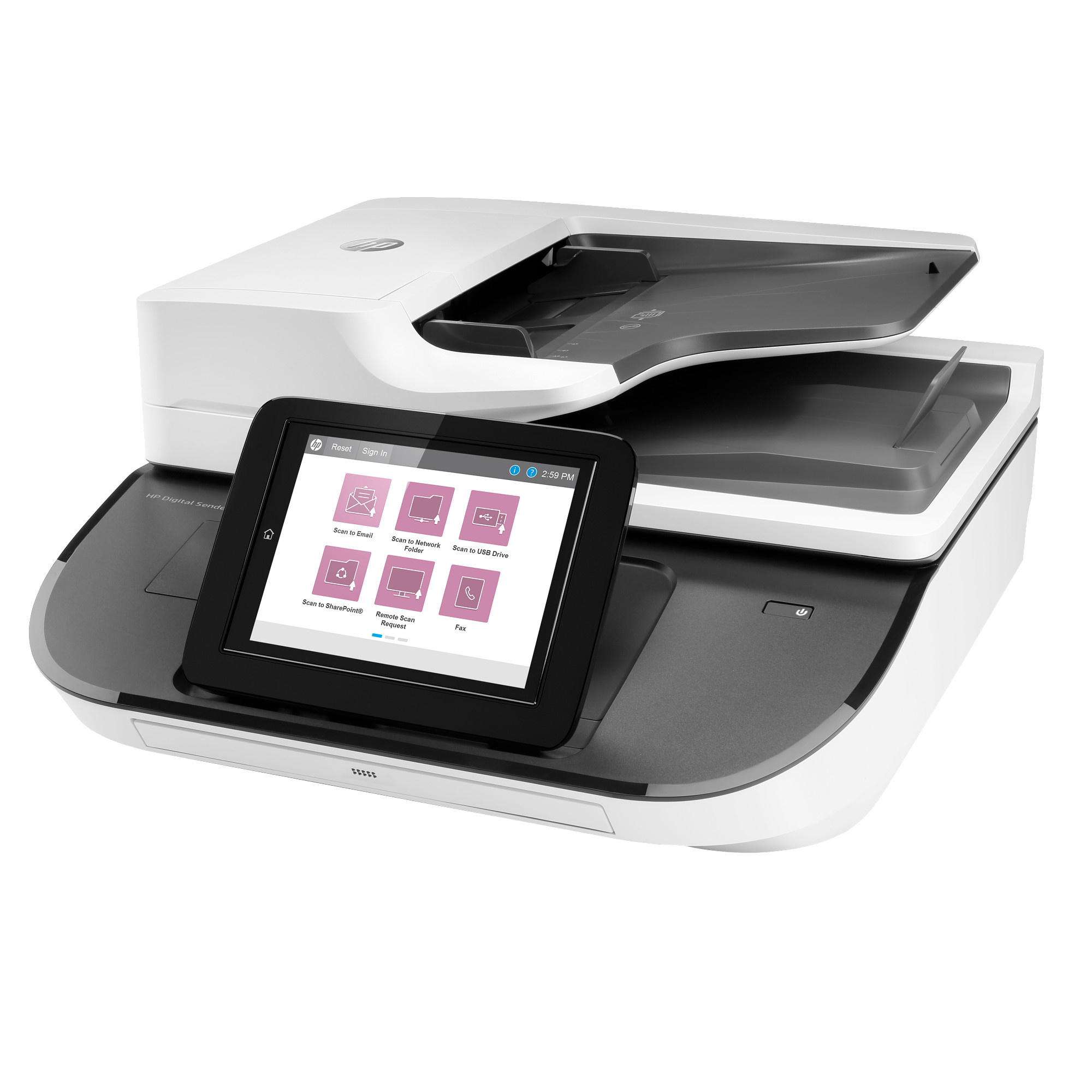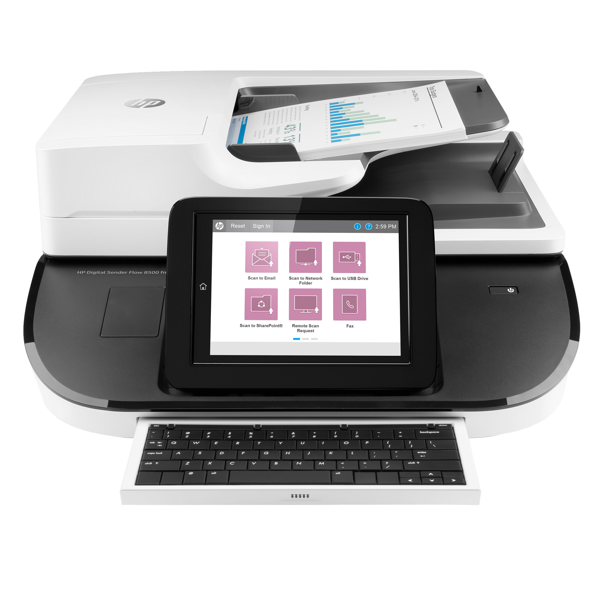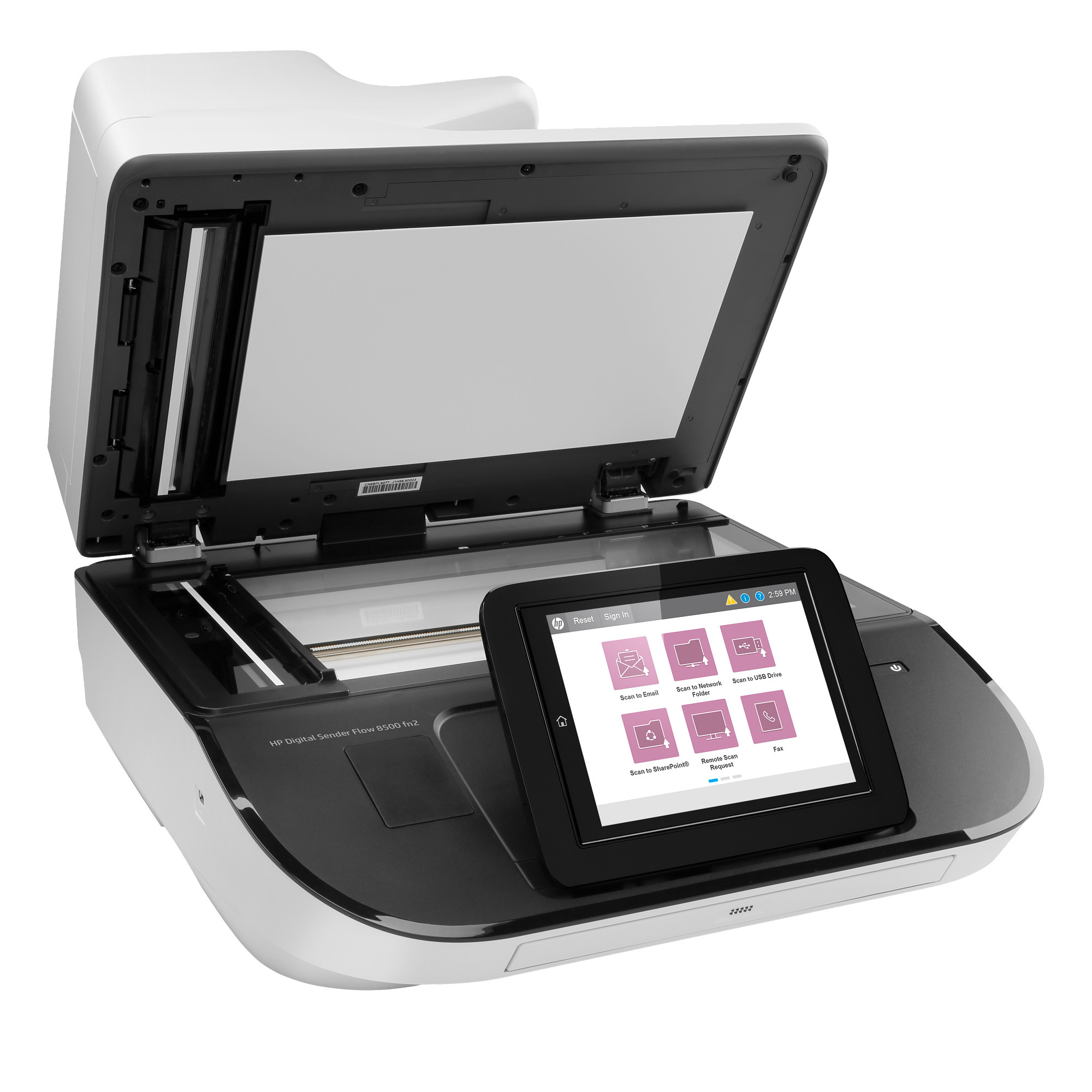 HP Digital Sender Flow 8500 fn2 Flabed Scanner (A4, 600x600, USB, Ethernet, podavač dokumentů)Automatický podavač dokumentů; Formát:A4; Rozhraní:USB, RJ-45 (Ethernet); Funkce:Fax; Skutečné rozlišení skeneru (v DPI):600; Typ skeneru:Plochý.