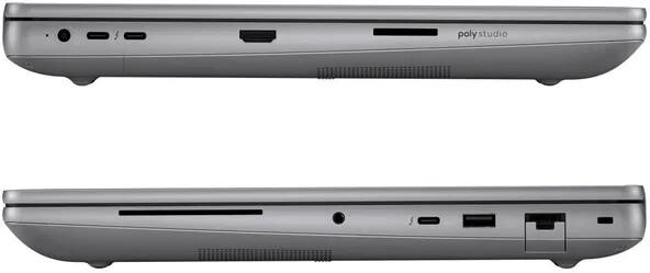 - USB-C s Thunderbolt 5, USB 3.2, WiFi 7, LAN, Bluetooth, HDMI, 5MP IR AI webkamera, čtečka otisků prstů, čtečka karet Smart Card, čtečka SD karet, podsvícená numerická klávesnice, celokovové šasi, zvuk Poly Studio