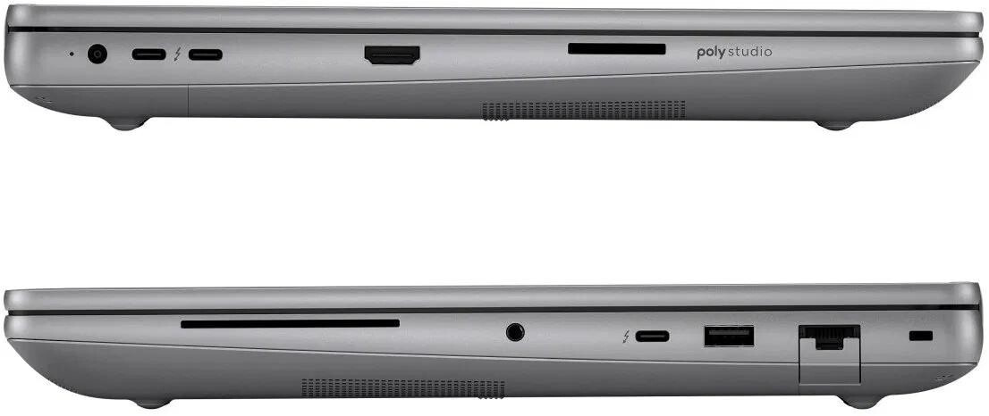 - USB-C s Thunderbolt 5, USB 3.2, WiFi 7, LAN, Bluetooth, HDMI, 5MP IR AI webkamera, čtečka otisků prstů, čtečka karet Smart Card, čtečka SD karet, podsvícená numerická klávesnice, celokovové šasi, zvuk Poly Studio, NFC