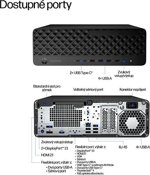 Pro připojení dalších zařízení vám poslouží u počítače HP patřičná konektorová výbava. Ta skýtá nepostradatelné rozhraní USB 2.0 u 3 konektorů a USB 3.2 Gen1 (USB 3.0), jenž budete mít 2×. Také budete moci pracovat s USB-C. Celou řadu zvukových zařízení můžete připojit díky kombinovanému Jack konektoru. Pro zapojení monitoru je u tohoto modelu počítače HP EliteDesk 8 SFF G1i AI Černá k dispozici HDMI a DisplayPort. Počítač pracuje s operačním systémem Windows 11 Pro.