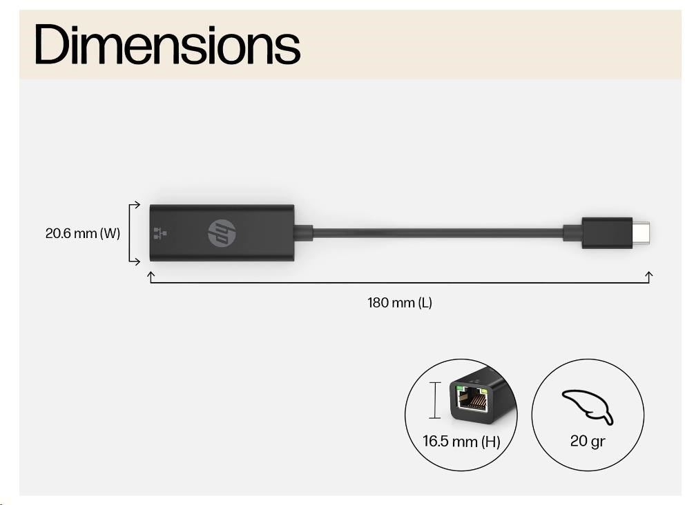 HP USB-C to RJ45 Adapter EURO Připojte své zařízení USB-C™ k síti Ethernet pomocí tohoto snadno přenosného ethernetového adaptéru typu plug-and-play. Kabelové připojení k síti Ethernet je zárukou vysoké rychlosti internetu a umožňuje rychlé a spolehlivé streamování a stahování digitálního obsahu. Podpora vysokých rychlostí - Podporuje rychlosti rozhraní Gigabit Ethernet pro snadné streamování a práci. Výborně přenosný - Lehké provedení si snadno vezmete všude tam, kde máte přístup k síti Ethernet. Spolehlivé pokrytí - Standardní jednoletá omezená záruka HP vám poskytne klid na práci.1.