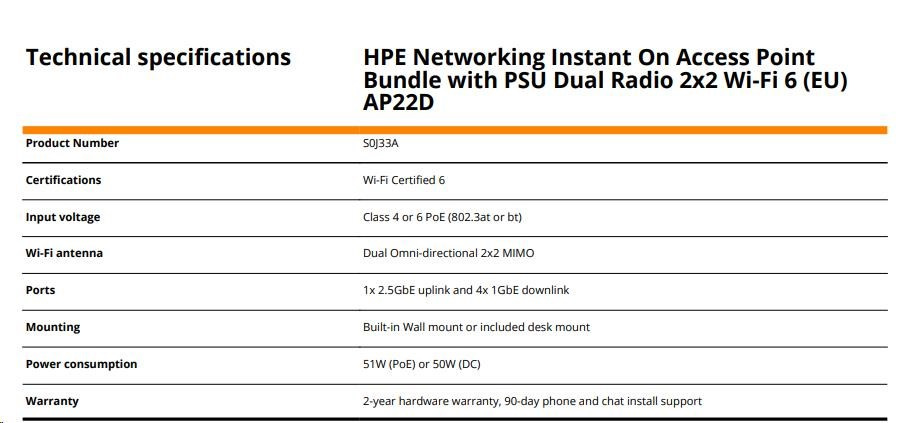 Máte k produktu dotaz? Zeptejte se nás.Hodnocení produktu HPE Aruba Instant On Access Point AP22D Bundle with PSU Dual Radio 2x2 Wi-Fi 6 (EU) AP22D (desktop or wallmount)