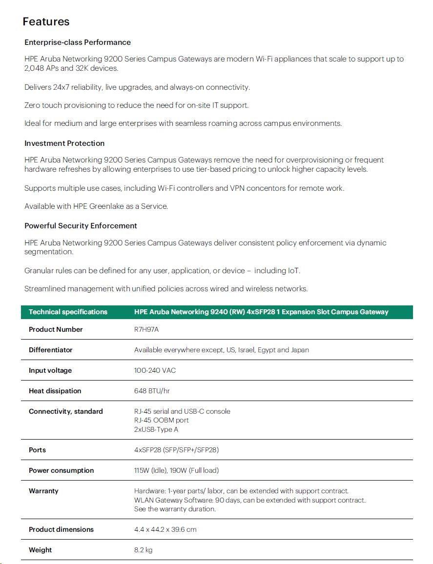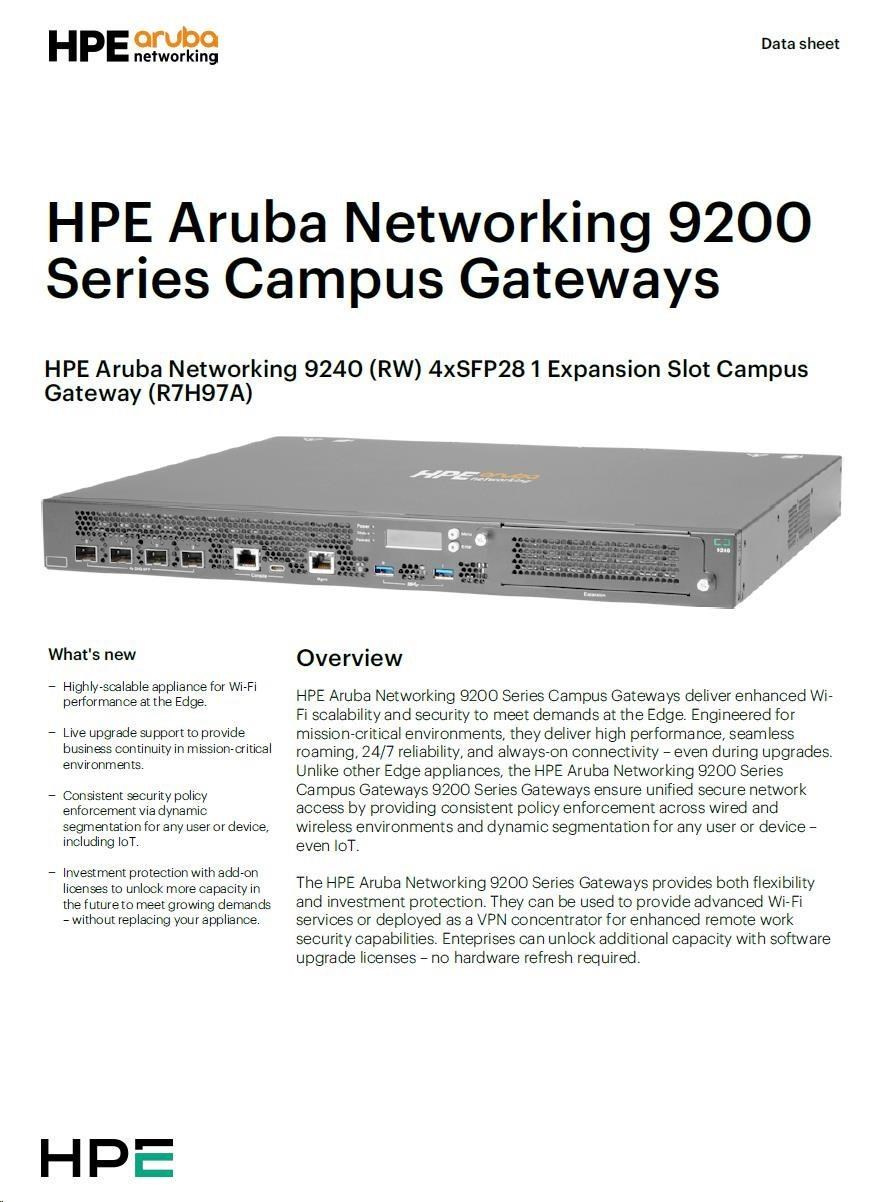 HPE Aruba Networking 9240 (RW) 4xSFP28 1 Expansion Slot Campus GatewayHPE Aruba Networking 9240 (RW) 4xSFP28 1 Expansion Slot Campus Gateway.