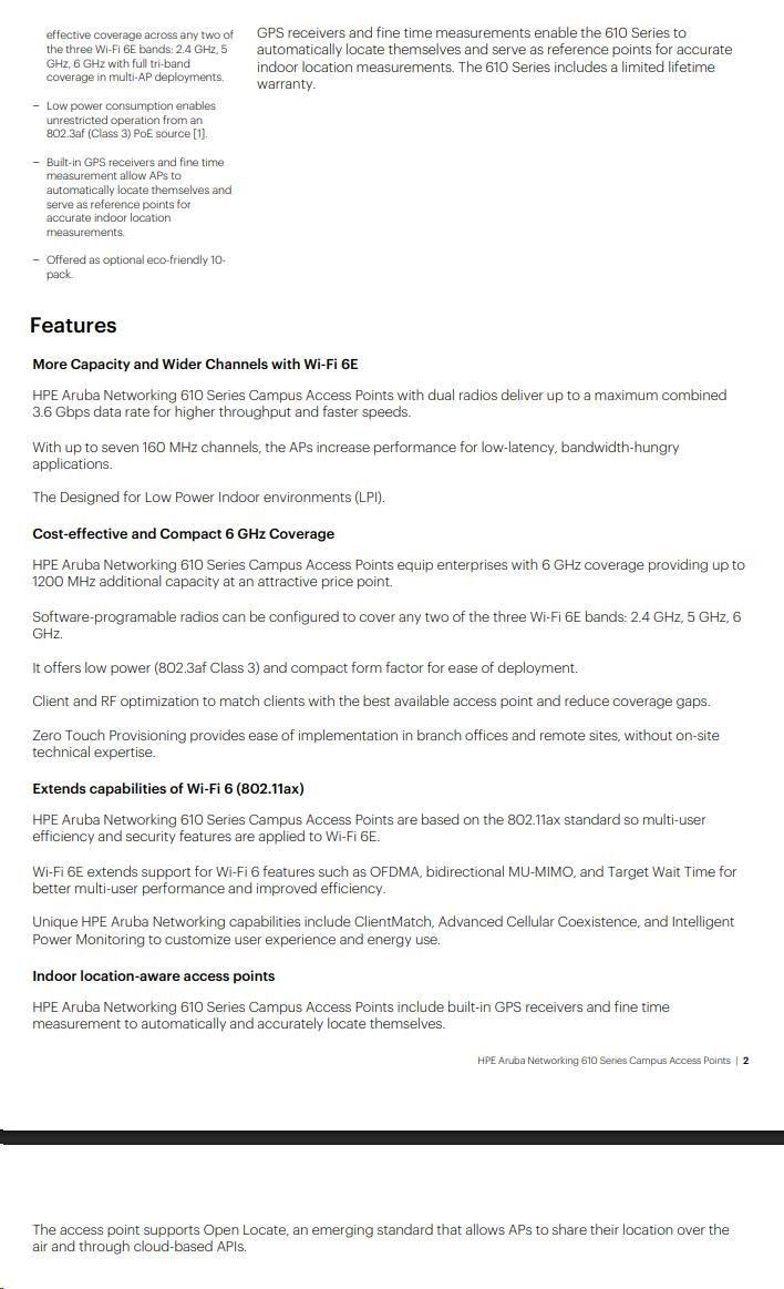 | Wi-Fi Optimization Client Optimization Aruba's patented AI-powered technology eliminates sticky client issues by steering a client to the AP where it receives the best radio signal. ClientMatch steers traffic from the noisy 2.4 GHz band to the preferred 5 GHz or 6 GHz band depending on client capabilities and AP setttings. ClientMatch also dynamically steers traffic to load balance APs to improve the user experience. Automated Wi-Fi Radio Frequency Management To optimize the user experience and provide greater stability, Aruba AirMatch allows organizations to automate network optimization using machine learning. AirMatch provides dynamic bandwidth adjustments to support changing device density, enhanced roaming using an even distribution of Effective Isotropic Radiated Power (EIRP) to radios, and real-time channel assignments to mitigate co-channel interference. AirMatch also ensures that the two radios of Aruba 610 Series Access Points are automatically configured in the most effective and efficient way to deliver full tri-band coverage. Application Assurance With Aruba Air Slice, organizations can provide application assurance to their users that goes beyond the traditional capabilities of airtime fairness. After the SLAs are configured, Air Slice monitors network usage, automatically allocates radio resources, and dynamically adjusts radio resources as new users connect and applications sessions begin or end. Aruba Advanced Cellular Coexistence (ACC) Unique to Aruba, Advanced Cellular Coexistence uses built-in filtering to automatically minimize the impact of interference from cellular networks, distributed antenna systems (DAS), and commercial small cell or femtocell equipment. Intelligent Power Monitoring (IPM) For better insights into energy consumption, Aruba APs continuously monitor and report hardware energy usage. Unlike other vendor's access points, Aruba APs can also be configured to enable or disable capabilities based on available PoE power - ideal when wired switches have exhausted their power budget. Enterprises can deploy Wi-Fi 6E APs and update switching and power at a later if needed based on their actual usage. Self-Locating APs Indoor location shouldn't require guesswork or costly overlay technologies. Aruba's Wi-Fi 6 and 6E APs help organizations leverage their wireless investment to deliver indoor location - everywhere. Aruba 610 Series Campus APs include built-in GPS receivers and intelligent software to allow them to automatically locate themselves accurately within the universal framework of latitude and longitude. As part of Aruba's indoor location services solution, they serve as reference points for client devices using fine time measurements (802.11mc) and other location technologies. In addition, Aruba's Wi-Fi 6 and 6E APs support Open Locate, an emerging standard that allows APs to share their location over the air and through cloud-based APIs, enabling mobile devices to locate themselves and applications to support network analytics. APs as an IoT transport platform The Aruba 610 Series includes an integrated Bluetooth 5 and 802.15.4 radio for Zigbee support to simplify deploying and managing IoT-based location services, asset tracking services, security solutions, and IoT sensors. There is also a USB-port extension to provide IoT connectivity to a wider range of devices. These IoT capabilities allows organizations to leverage Aruba APs as an IoT transport platform, which eliminates the need for an overlay infrastructure and additional IT resources and can accelerate IoT initiatives. In addition, Target Wake Time (TWT), part of the 802.11ax standard, establishes a schedule for when clients need to communicate with an AP. This helps improve client power savings and reduces airtime contention with other clients, which is ideal for IoT. Aruba secure infrastructure The Aruba 610 Series includes build-security capabilities such as: