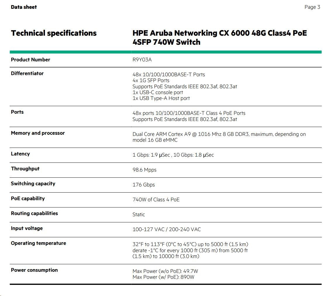 The HPE Aruba Networking CX 6000 Switch Series offers Ethernet gigabit connectivity and optional PoE to provide entry level, reliable, and convenient wired access connectivity for enterprise branch offices and SMB networks. Delivers a simple, consistent operator experience with the HPE Aruba Networking CX Switch Operating System (AOS-CX) used across HPE Aruba Networking CX switching platforms. Fully-managed enterprise vclass switches deliver Layer 2 capabilities with support static routing, ACLs, robust QoS, traffic prioritization, sFlow, and IPv6. Right size deployment with choice of 12, 24, and 48 port 1U models with convenient built-in 1 GbE uplinks and up to 740W of Class 4 PoE. Simplifies ownership with no switch software licensing or subscriptions required.