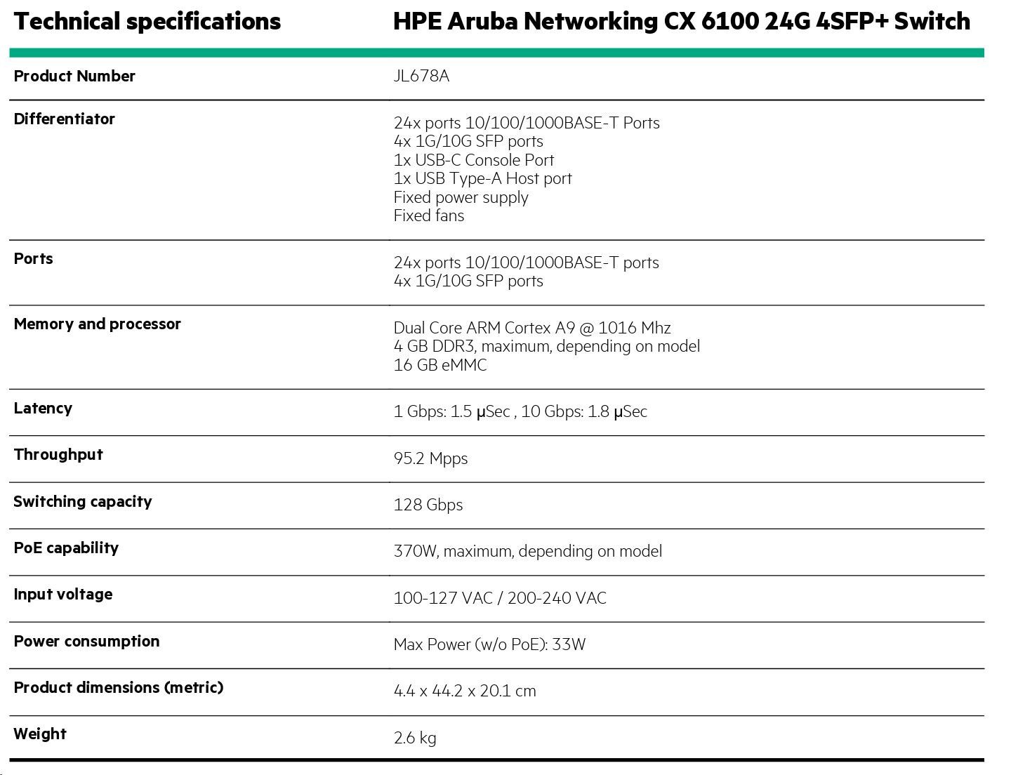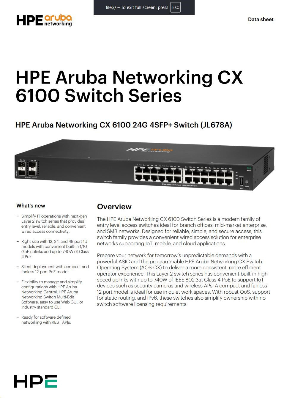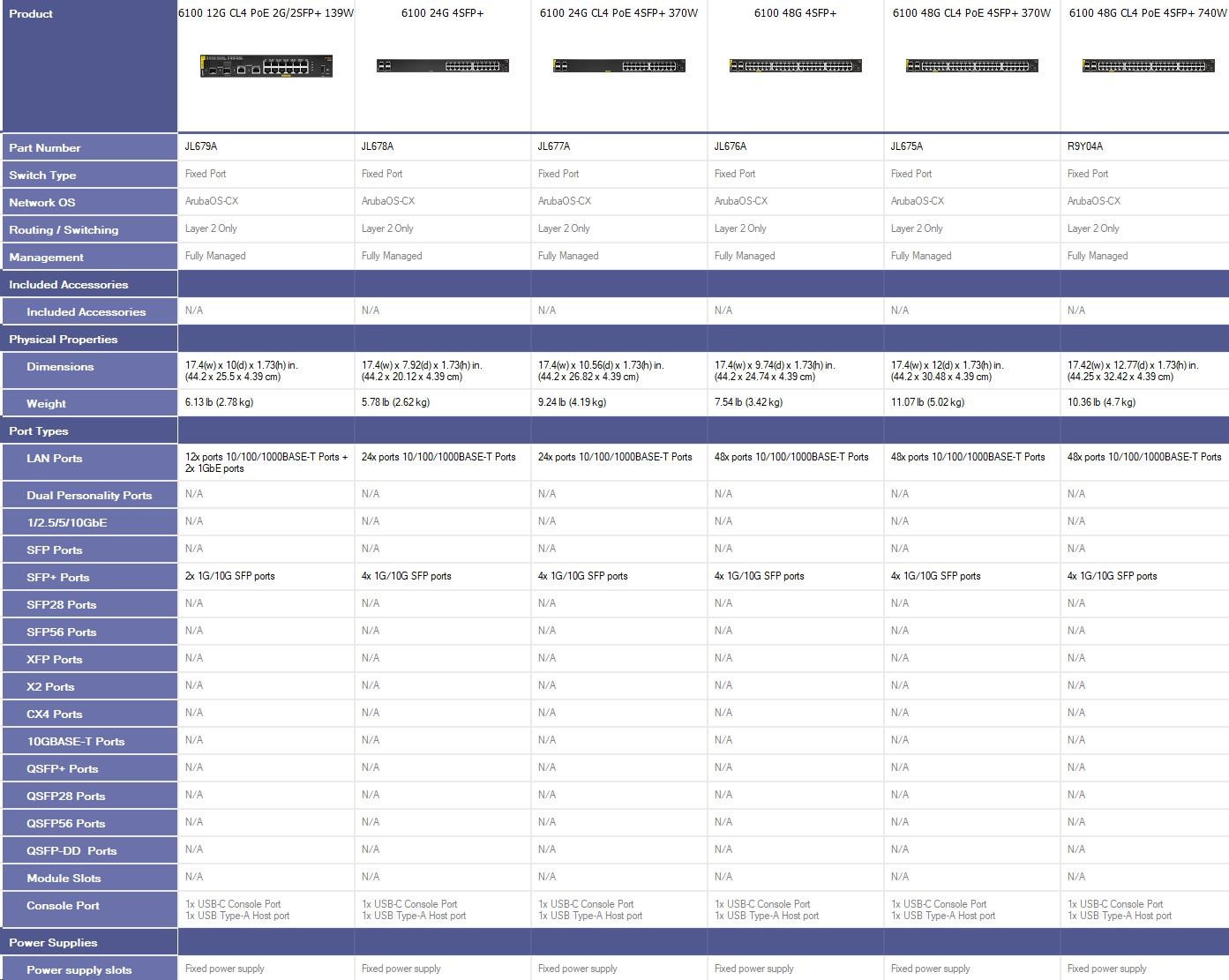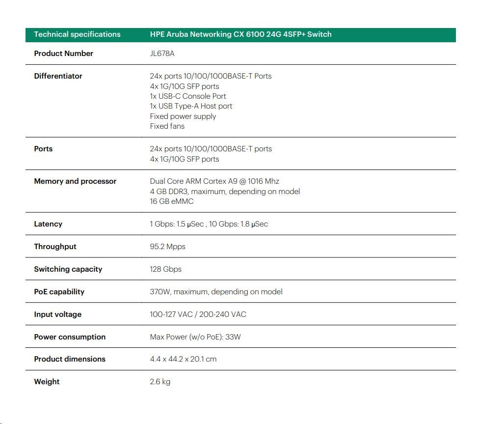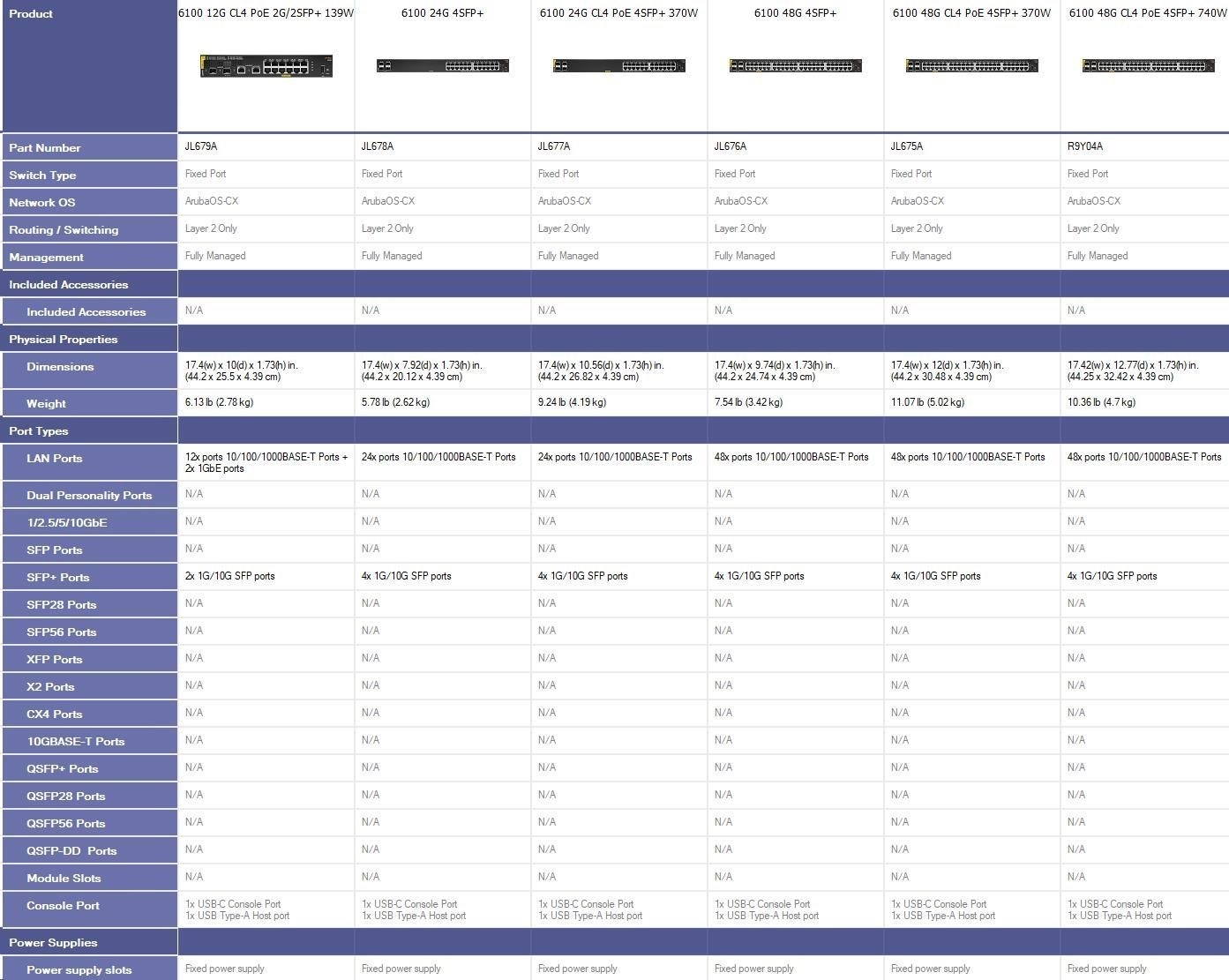 - Model: Aruba CX 6100 24G 4SFP+ Switch (JL678A)