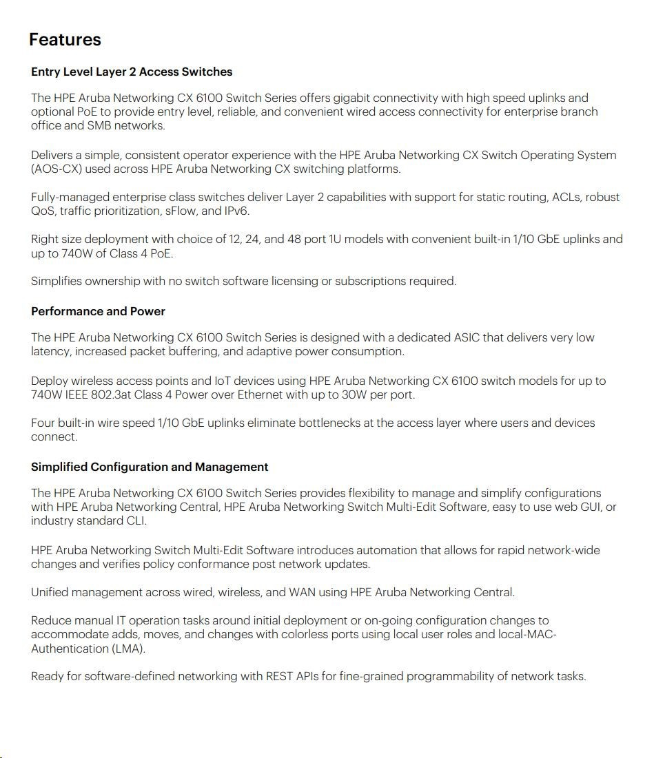 HPE Aruba Networking CX 6100 24G 4SFP+ (JL678A) je plně spravovatelný síťový přepínač navržený pro malé až středně velké podnikové sítě, které vyžadují vysokou dostupnost, výkon a flexibilitu. Tento model ze série Aruba CX 6100 poskytuje základní přístupovou vrstvu s pokročilými funkcemi, které zajišťují bezpečné, škálovatelné a snadno spravovatelné síťové prostředí.