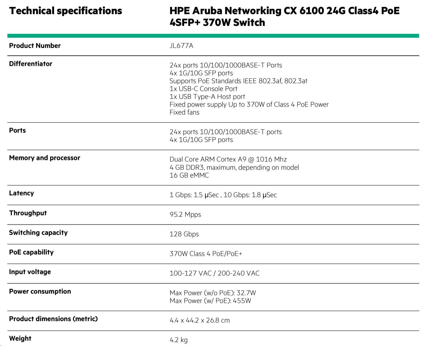 HPE Aruba Networking CX 6100 24G Class4 PoE 4SFP+ 370W Switch (JL677A)