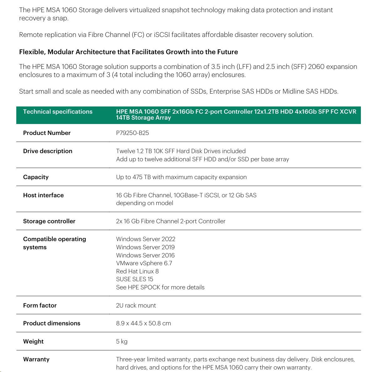 HPE MSA 1060 SFF 2x16Gb FC 2-port Controller 12x1.2TB HDD 4x16Gb SFP FC XCVR 14TB Storage Array Smart ChoiceSpecifikace zálohovacího systému:SAN; Provedení skříně:Do rozvaděče; Připojitelnost zálohovacího systému:Fibre Channel.