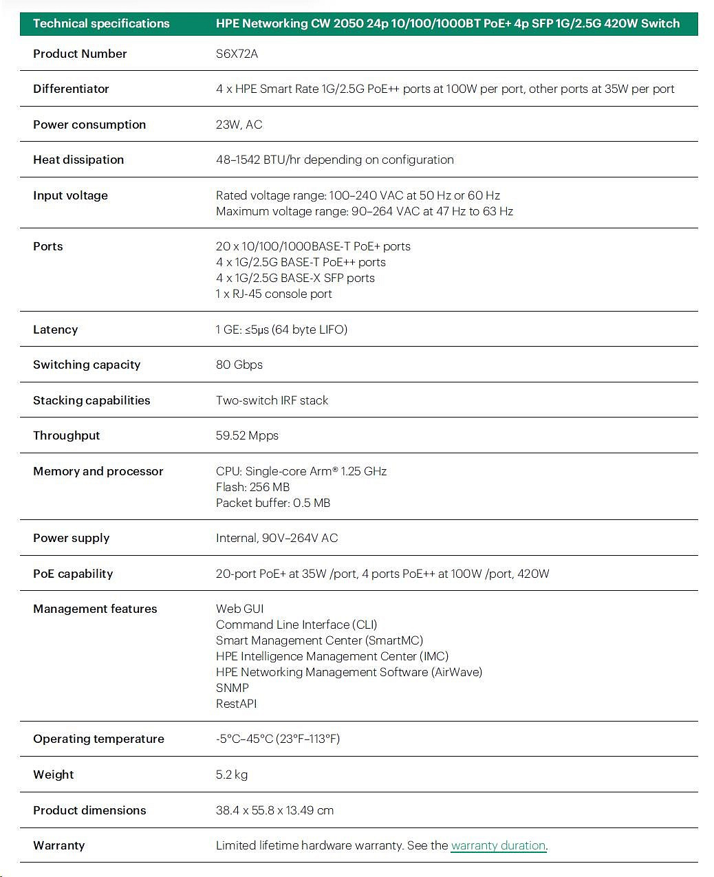 HPE Networking CW 2050 24p 10/100/1000BT PoE+ 4p SFP 1G/2.5G 420W Switch