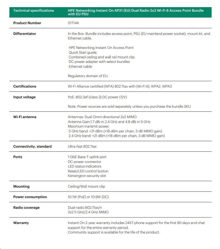 HPE Networking Instant On AP21 (EU) Dual Radio 2x2 Wi-Fi 6 Access Point Bundle with EU PSUTyp aktivního prvku:AP (Access Point); Frekvenční pásmo (GHz):2,4 + 5 (Dual Band); Podporované standardy:802.11ax; Zabezpečení:WPA2, WPA3; Typ antény:Integrovaná; USB port; Slot na SIM kartu; Použití:Vnitřní; Typy PoE:PoE - In; Počet portů LAN:0; Počet portů LAN:0; Počet WAN portů:1; Počet WAN portů:1.