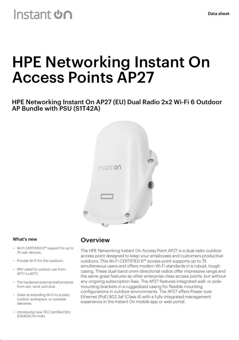 Diskuze k produktu HPE Networking Instant On AP27 (EU) Dual Radio 2x2 Wi-Fi 6 Outdoor AP Bundle with PS (Includes 30W PoE midspan injector