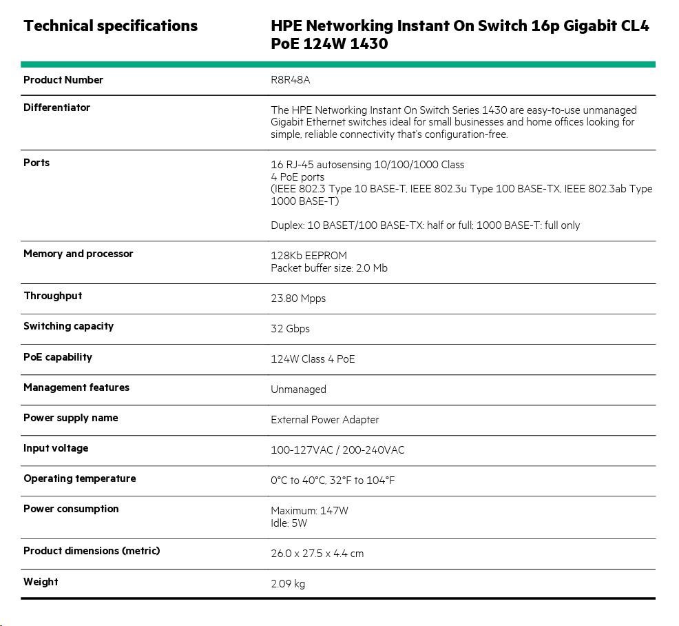 Kód: 1881017Prodejní číslo: R8R48A#ABBHPE Networking Instant On Switch 16p Gigabit CL4 PoE 124W 1430