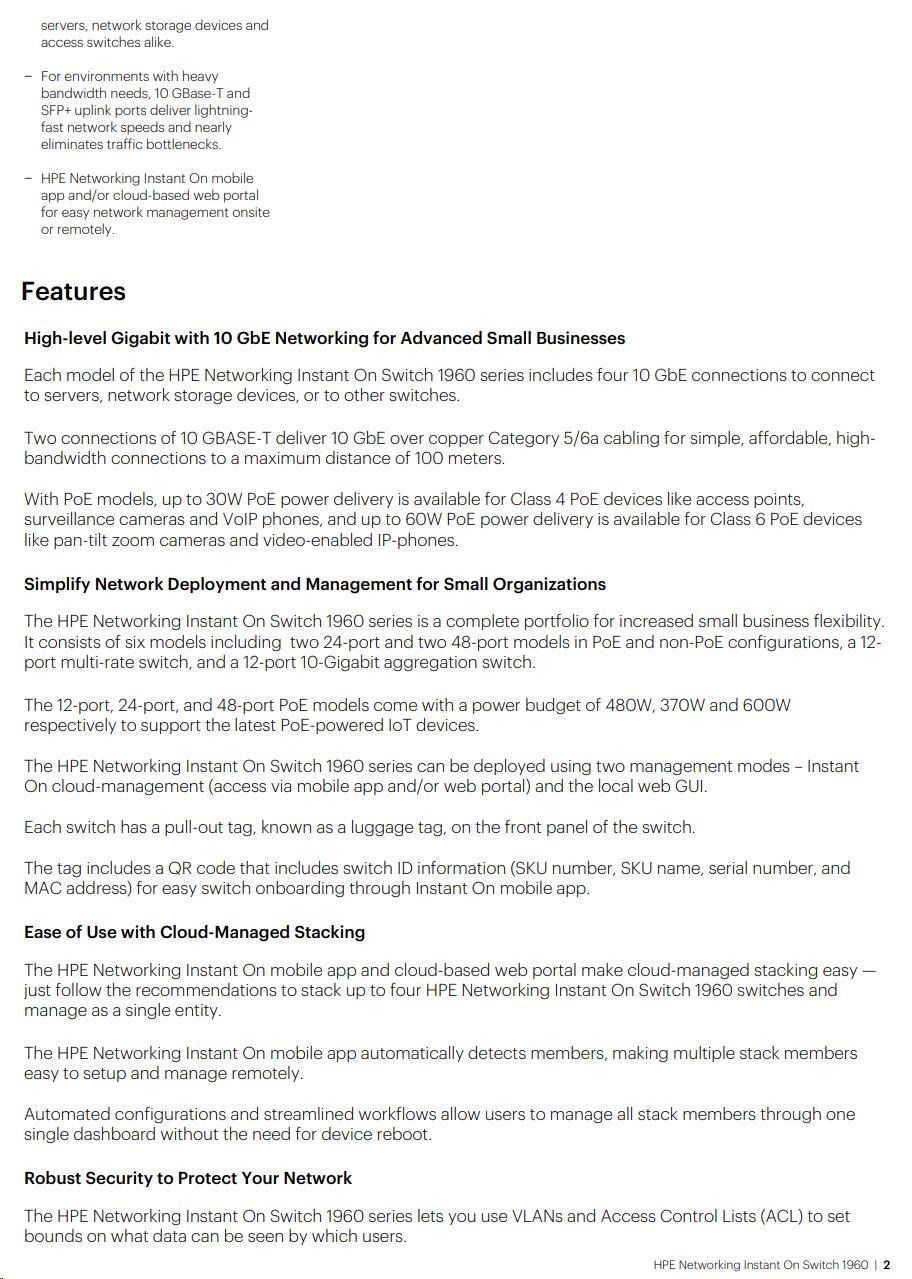 | The Instant On Differentiators The Aruba Instant On mobile app allows you to set up, manage, and monitor Instant On switches and access points directly from your phone. Within the app, you get guided step-by-step instructions to install Instant On devices to get your network up and running quickly - no technical expertise required. And cloud-based access allows you to access the network from anywhere, at any time. Cloud-Managed Stacking The Aruba Instant On mobile app and cloud-based web portal make cloud-managed stacking easy - just follow the recommendations to stack up to four (4) 1960 switches and manage as a single entity. The Instant On mobile app automatically detects members, making multiple stack members easy to setup and manage remotely. Automated configurations and streamlined workflows allow users to manage all stack members through one single dashboard without the need for device reboot. Luggage Tag Each switch has a pull-out tag, known as a luggage tag, on the front panel of the switch. The tag includes a QR code that includes switch ID information (SKU number, SKU name, serial number, and MAC address) for easy switch onboarding through Instant On mobile app. Non-Intrusive, Aesthetic Design Aruba Instant On switches are designed to complement the sleek and clean look of the Instant On access points, and to blend discreetly into your site's environment. The 8-port models, as well as the 24- and 48-port non PoE+ models, are fan-less, making them ideal for quiet office deployments. High Performance With Flexible Options The series consists of two (2) PoE switches, and two (2) non-PoE switches including 24- and 48-port Gigabit Ethernet switches with two (2) dedicated 10G SFP+ ports and two (2) 10GBASE-T uplink ports on 24-/48- port models. The series also includes a 12-port 10Gbps aggregation switch with four (4) 10G SFP+ ports to meet the bandwidth requirements of small businesses. Optimized User Experience The Aruba Instant On mobile app provides common workflows for Instant On switches and access points making it easier to configure, monitor and manage your network remotely without the need for additional hardware like cloud keys. You can also update firmware on your Instant On devices directly from the cloud whenever you want, from wherever you are. Site Inventory And Topology View The site inventory view shows all Instant On switches and access points on a single interface, and the topology view provides an intuitive structure of all Instant On devices deployed on the network - allowing you to quickly identify non-functioning devices and troubleshoot accordingly. Network issues can be easily diagnosed with connectivity tests like Ping and Traceroute. Multi-Site Remote Management The cloud-hosted web interface and mobile app make it easy to remotely manage multiple sites, multiple networks, distributed deployments and multi-tenant deployments. Each site is logically separated and has its own configuration, statistics, guest portal, and admin read/write privileges. Instant On allows you to create three admin accounts per site, offering the option to lock accounts from accidental deletion or to allow your account to be managed by a trusted partner. Built-In Security Built-in security features protect your network from external threats by blocking malware attacks and keeping unauthorized users off the network. Network traffic can be filtered and access restricted based on MAC and IP address. No Hidden Fees All features are included in the price of the hardware - there are no recurring subscription or licensing fees. Expert-level support and industry leading limited lifetime warranty are also included, along with chat support for the life of the product. |