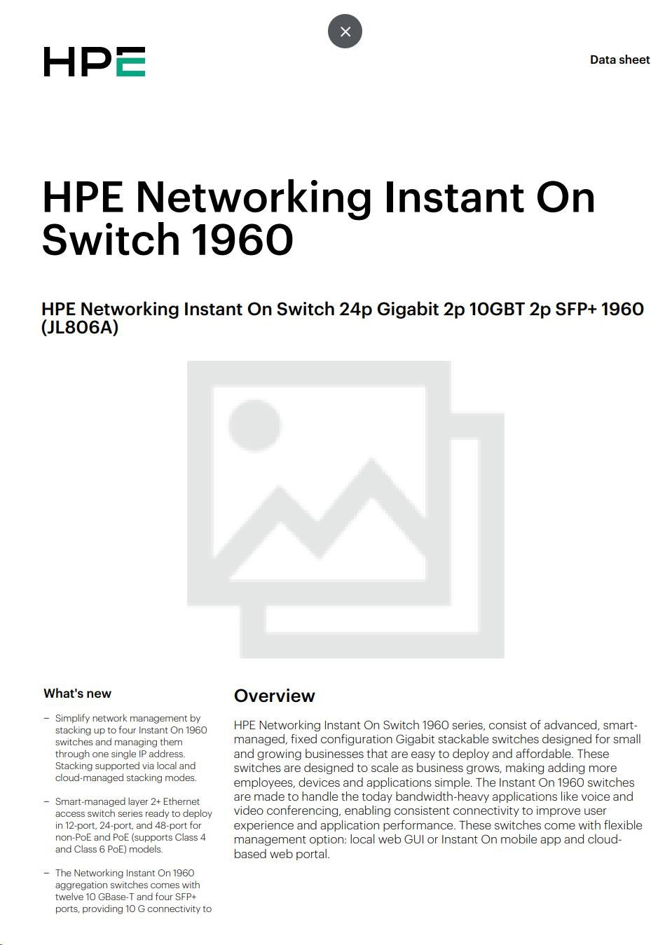 | In today's digital-first environment, small businesses face many challenges to stay afloat and competitive. With tight budgets and limited technical expertise, they're struggling to keep up with the explosion of devices and bandwidth-heavy applications running on the network. To optimize both performance and investment, small businesses need cost-effective, next-gen networking solutions. The Aruba Instant On 1960 Switch Series is an easy-to-use and affordable wired solution for networks supporting IT, mobile and cloud applications. Aruba Instant On 1960 Switches are advanced, smart-managed, fixed configuration Gigabit stackable switches designed for small and growing businesses that are easy to deploy and affordable. These switches are designed to scale as business grows, making adding more employees, devices and applications simple. Aruba Instant On 1960 switches are made to handle today's bandwidth-heavy applications like voice and video conferencing, enabling consistent connectivity to improve user experience and application performance.