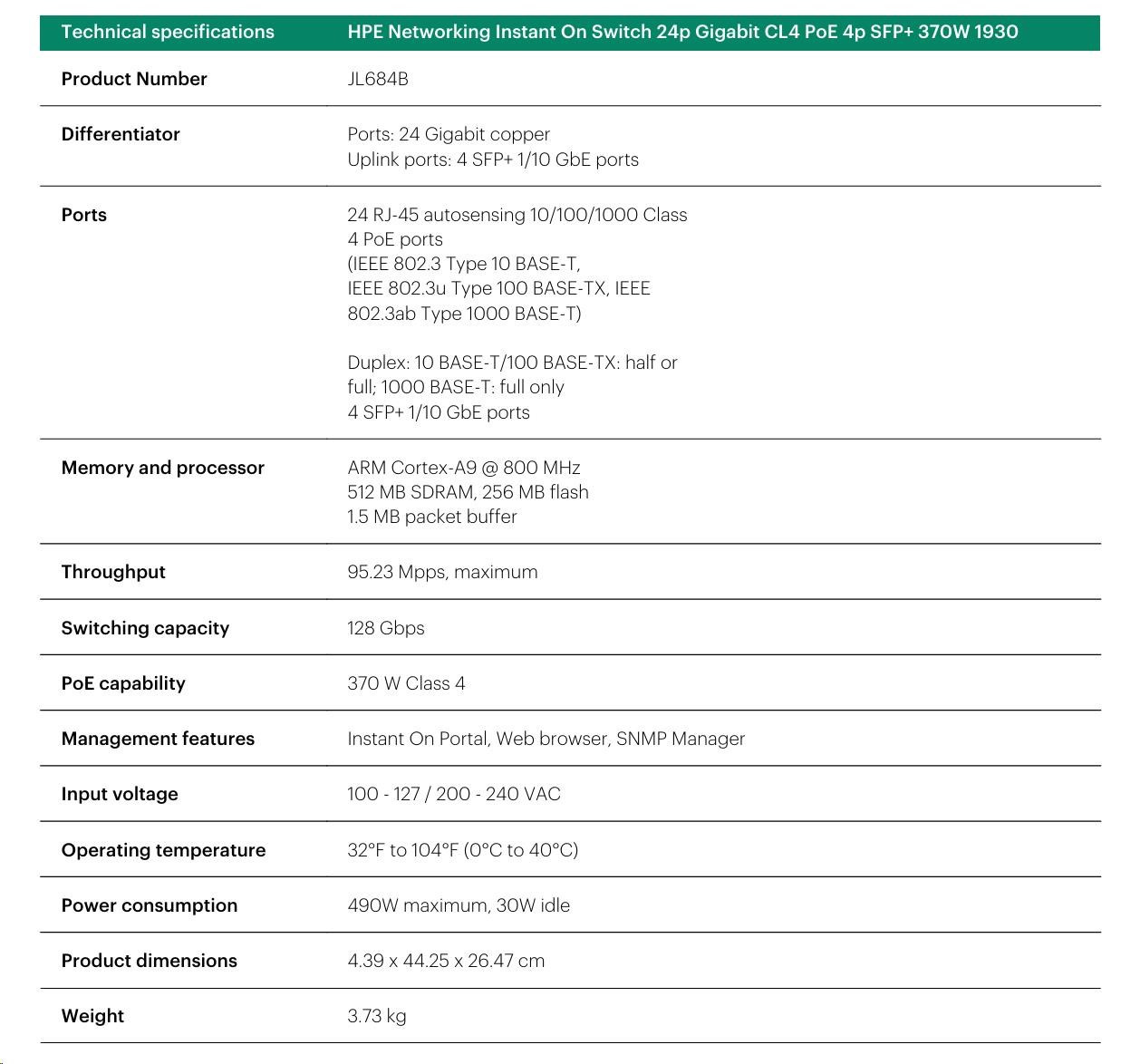 HPE Networking Instant On Switch 24p Gigabit CL4 PoE 4p SFP+ 370W 1930 (JL684B)