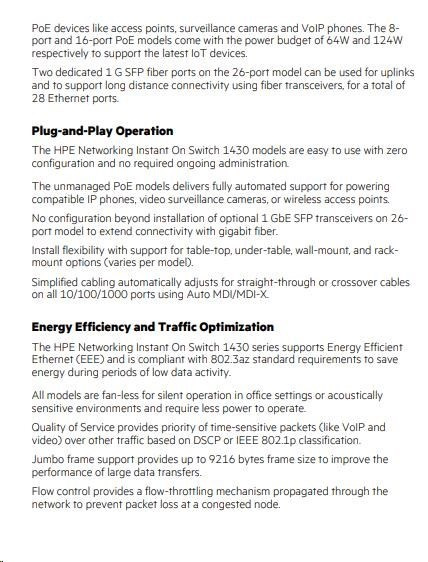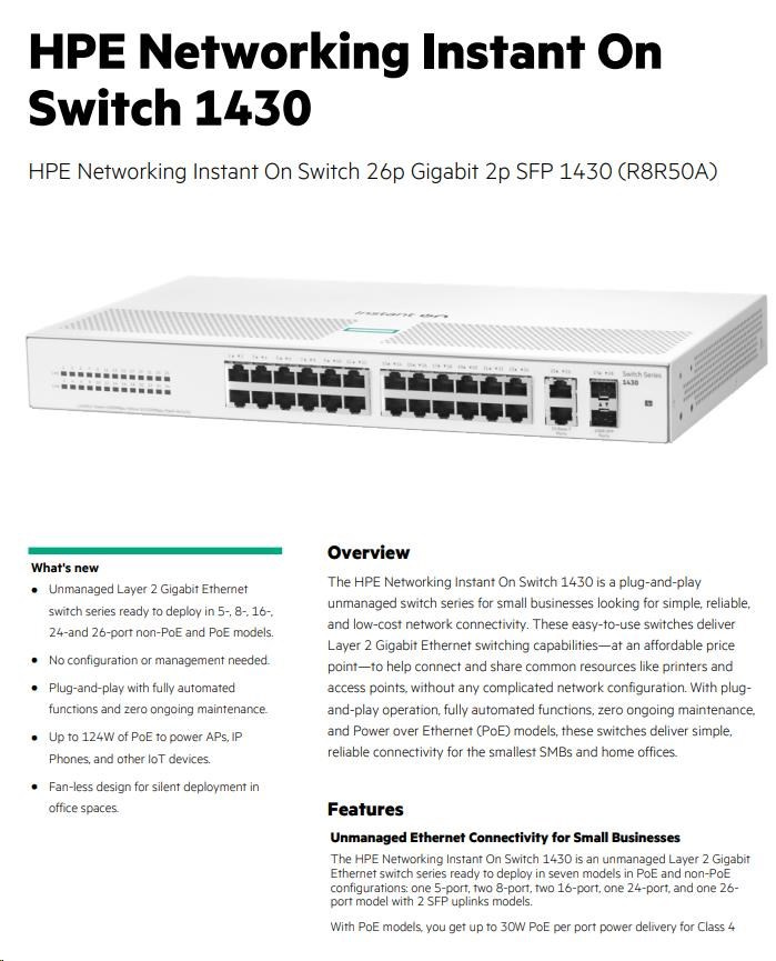 Aruba Instant On 1430 26G 2SFP je výkonný, kompaktní a bezventilátorový gigabitový switch určený pro malé firmy, kanceláře či domácí sítě, které vyžadují spolehlivost a jednoduchost bez nutnosti komplexní správy.