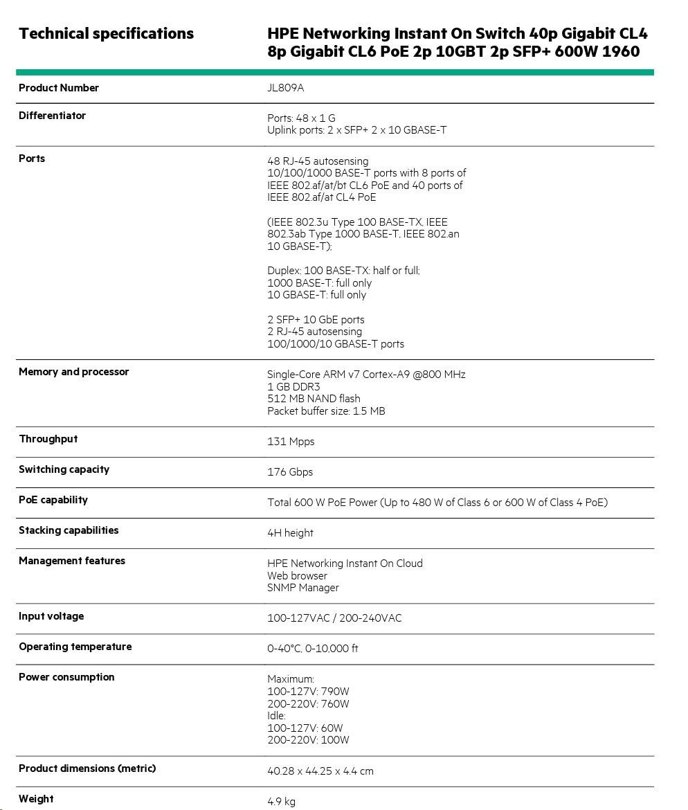 HPE Networking Instant On Switch 40p Gigabit CL4 8p Gigabit CL6 PoE 2p 10GBT 2p SFP+ 600W 1960 (JL809A)